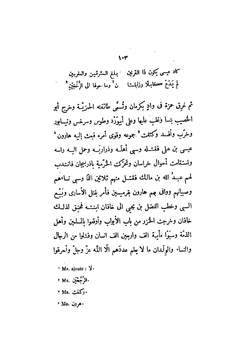 ثم غرق حمزة في واد بكرمان وتسمى طائفته الحمزية وخرج أبو الخصيب بنسا وغلب عليها وعلى أبيورد وطوس وسرخس ونيسابور وخرب وأفسد وكثفت [3] جموعه وقوي أمره فبعث إليه هارون [4] عيسى بن علي فقتله وسبى أهله وذراريه وحمل إليه رأسه واستقامت أحوال خراسان وتحركت الخرمية بأذربيجان فانتدب لهم عبد الله بن مالك فقتل منهم ثلاثين ألفاً وسبى نساءهم وصبيانهم ووافى بهم هارون بقرميسين فأمر بقتل الأسارى وبيع السبى وخطب الفضل بن يحيى إلى خاقان ابنته فحنق لذلك خاقان وخرجت الخزر من باب الأبواب وأوقعوا بالمسلمين وأهل الذمة وسبوا مائة ألف وأربعين ألف إنسان وقتلوا من الرجال والنساء والولدان ما لا يعلم عددهم الّا الله عزّ وجلّ وأحرقوا