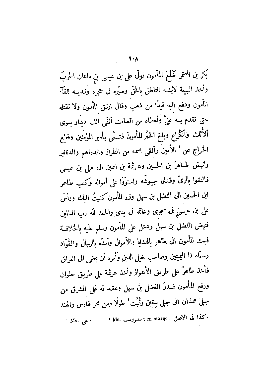 بكر بن المعتمر خلع المأمون فولّى على بن عيسى بن ماهان الحرب وأخذ البيعة لابنه الناطق بالحق وصيره في حجره وندبه للقاء المأمون ودفع إليه قيداً من ذهب وقال أوثق المأمون ولا تقتله حتى تقدم به علي وأعطاه من الصامت ألفي ألف دينار سوى الأثاث والكراع وبلغ الخبر المأمون فتسمى بأمير المؤمنين وقطع الخراج عن [1] الأمين وألقى اسمه من الطراز والدراهم والدنانير وانهض طاهر بن الحسين وهرثمة بن أعين إلى علي بن عيسى فالتقوا بالري وقتلوا جيوشه واحتووا على أمواله وكتب طاهر ابن الحسين إلى الفضل بن سهل وزير المأمون كتبت إليك ورأس علي بن عيسى في حجري وخاتمه في يدي والحمد للَّه رب العالمين فنهض الفضل بن سهل ودخل على المأمون وسلم عليه بالخلافة فبعث المأمون إلى طاهر بالهدايا والأموال وأمده بالرجال والقواد وسماه ذا اليمينين وصاحب خيل الدين وأمره أن يمضي إلى العراق فأخذ طاهر على طريق الأهواز وأخذ هرثمة على طريق حلوان ورفع المأمون قدر الفضل بن سهل وعقد له على المشرق من جبل همذان إلى جبل سقين وتبت [2] طولاً ومن بحر فارس والهند