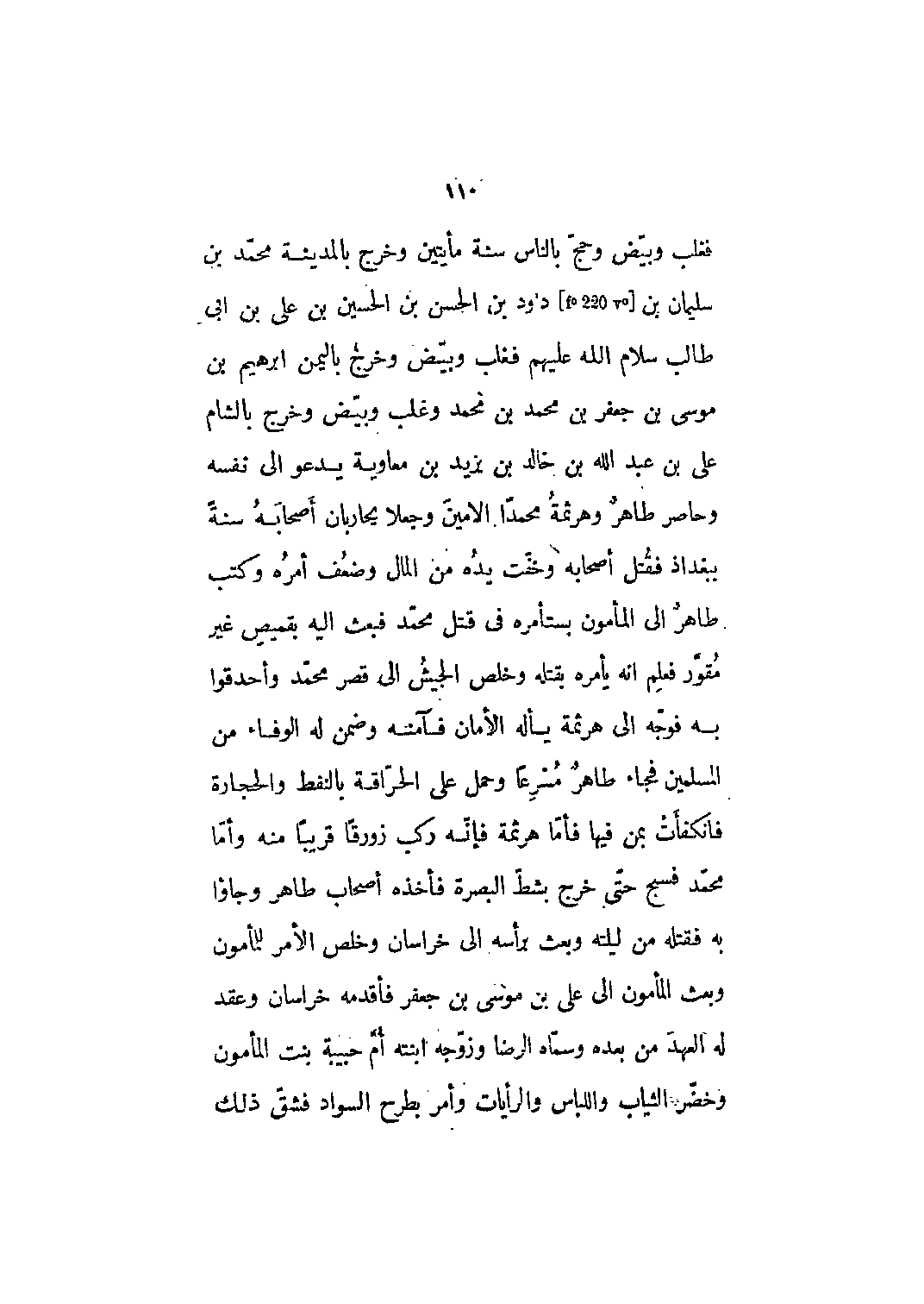 فغلب وبيض وحج بالناس سنة مائتين وخرج بالمدينة محمد بن سليمان بن [F؟ 220 V؟] داود بن الحسن بن الحسين بن علي بن أبي طالب سلام الله عليهم فغلب وبيض وخرج باليمن إبراهيم بن موسى بن جعفر بن محمّد بن محمد وغلب وبيض وخرج بالشام على بن عبد الله بن خالد بن يزيد بن معاوية يدعو إلى نفسه وحاصر طاهر وهرثمة محمداً الأمين وجعلا يحاربان أصحابه سنة ببغداذ فقتل أصحابه وخفت يده من المال وضعف أمره وكتب طاهر إلى المأمون يستأمره في قتل محمد فبعث إليه بقميص غير مقور فعلم أنه يأمره بقتله وخلص الجيش إلى قصر محمد وأحدقوا به فوجه إلى هرثمة يسأله الأمان فآمنه وضمن له الوفاء من المسلمين فجاء طاهر مسرعاً وحمل على الحراقة بالنفط والحجارة فانكفأت بمن فيها فأما هرثمة فإنه ركب زورقاً قريباً منه وأما محمد فسبح حتى خرج بشط البصرة فأخذه أصحاب طاهر وجاءوا به فقتله من ليلته وبعث برأسه إلى خراسان وخلص الأمر للمأمون وبعث المأمون إلى علي بن موسى بن جعفر فأقدمه خراسان وعقد له العهد من بعده وسماه الرضا وزوجه ابنته أم حبيبة بنت المأمون وخضر الثياب واللباس والرايات وأمر بطرح السواد فشق ذلك