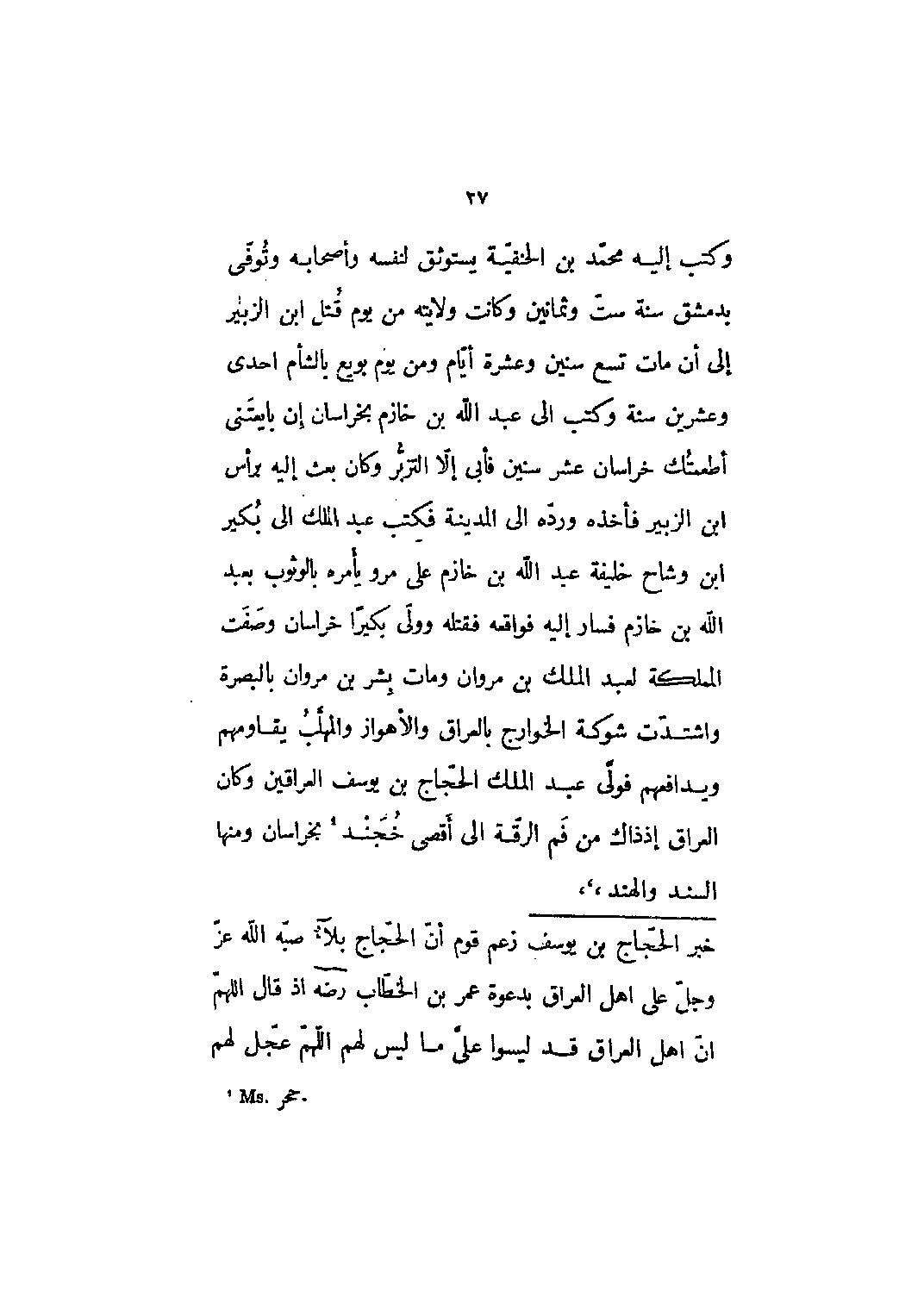 وكتب إليه محمد بن الحنفية يستوثق لنفسه وأصحابه وتوفي بدمشق سنة ست وثمانين وكانت ولايته من يوم قتل ابن الزبير إلى أن مات تسع سنين وعشرة أيام ومن يوم بويع بالشام إحدى وعشرين سنة وكتب إلى عبد الله بن خازم بخراسان إن بايعتني أطعمتك خراسان عشر سنين فأبى إلا التزبر وكان بعث إليه برأس ابن الزبير فأخذه ورده إلى المدينة فكتب عبد الملك الى بكير ابن وشاح خليفة عبد الله بن خازم على مرو يأمره بالوثوب بعبد الله بن خازم فسار إليه فواقعه فقتله وولى بكيراً خراسان وصفت المملكة لعبد الملك بن مروان ومات بشر بن مروان بالبصرة واشتدت شوكة الخوارج بالعراق والأهواز والمهلب يقاومهم ويدافعهم فولى عبد الملك الحجاج بن يوسف العراقين وكان العراق إذ ذاك من فم الرقة إلى أقصى خجند [1] بخراسان ومنها السند والهند،،،