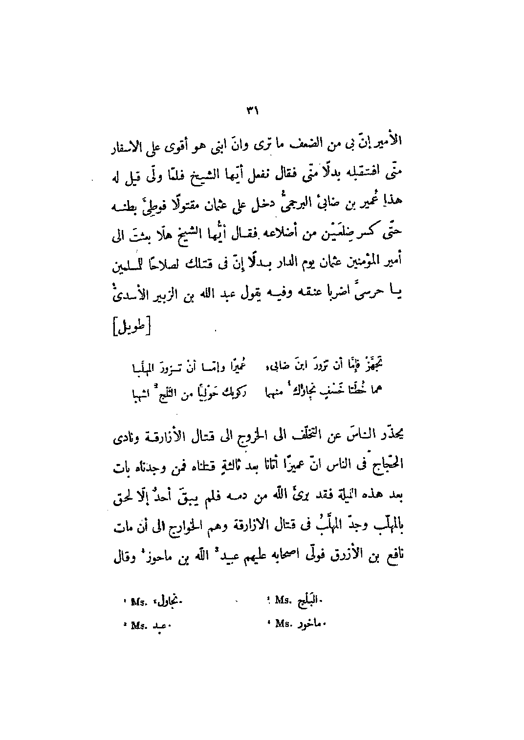 يحذر الناس عن التخلف إلى الخروج إلى قتال الأزارقة ونادى الحجاج في الناس أن عميراً أتانا بعد ثالثة قتلناه فمن وجدناه بات بعد هذه الليلة فقد بريء الله من دمه فلم يبق أحد إلا لحق بالمهلب وجد المهلب في قتال الأزارقة وهم الخوارج إلى أن مات نافع بن الأزرق فولى أصحابه عليهم عبيد [3] الله بن ماحوز [4] وقال