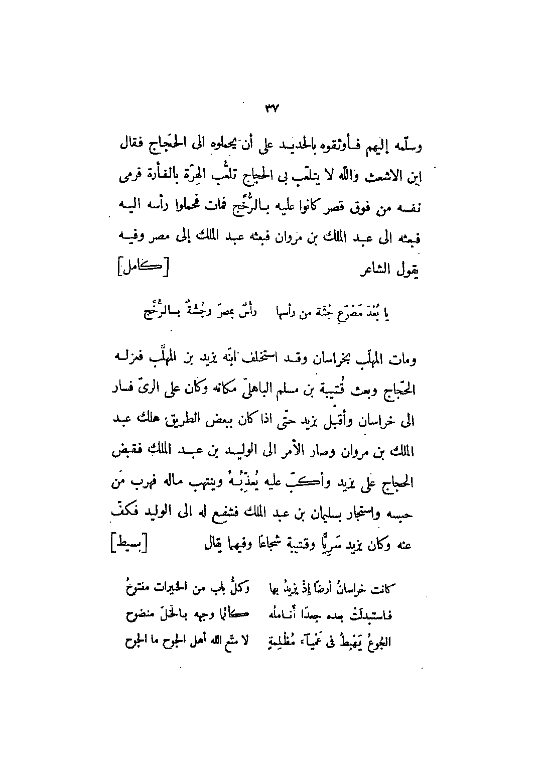 ومات المهلب بخراسان وقد استخلف ابنه يزيد بن المهلب فعزله الحجاج وبعث قتيبة بن مسلم الباهلي مكانه وكان على الري فسار إلى خراسان وأقبل يزيد حتى إذا كان ببعض الطريق هلك عبد الملك بن مروان وصار الأمر إلى الوليد بن عبد الملك فقبض الحجاج على يزيد وأكب عليه يعذبه وينتهب ماله فهرب من حبسه واستجار بسليمان بن عبد الملك فشفع له إلى الوليد فكف عنه وكان يزيد سريّا وقتيبة شجاعا وفيهما يقال [بسيط]