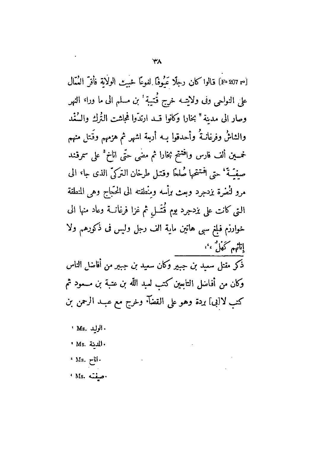 [F؟ 207 r؟] قالوا كان رجلاً عيوفاً لفوعاً خبيث الولاية فأقر العمال على النواحي وفي ولايته خرج قتيبة [1] بن مسلم إلى ما وراء النهر وصار إلى مدينة [2] بخارا وكانوا قد ارتدوا فجاشت الترك والسغد والشاش وفرغانة وأحدقوا به أربعة أشهر ثم هزمهم وقتل منهم خمسين ألف فارس وافتتح بخارا ثم مضى حتى أناخ [3] على سمرقند صيفية [4] حتى افتتحها صلحاً وقتل طرخان التركي الذي جاء إلى مرو لنصرة يزدجرد وبعث برأسه ومنطقته إلى الحجاج وهي المنطقة التي كانت على يزدجرد يوم قتل ثم غزا فرغانة وعاد منها إلى خوارزم فبلغ سبى هاتين مائة ألف رجل وليس في ذكورهم ولا إناثهم كهل،،،