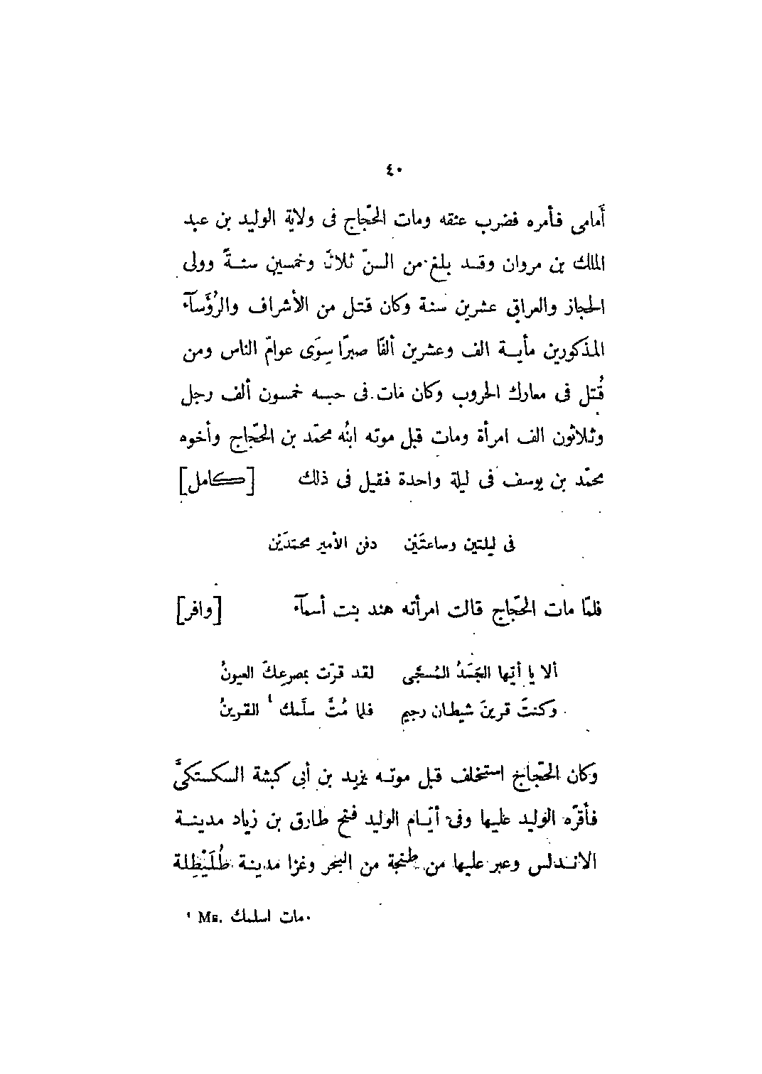أمامي فأمره فضرب عنقه ومات الحجاج في ولاية الوليد بن عبد الملك بن مروان وقد بلغ من السن ثلاثاً وخمسين سنة وولى الحجاز والعراق عشرين سنة وكان قتل من الأشراف والرؤساء المذكورين مائة ألف وعشرين ألفاً صبراً سوى عوام الناس ومن قتل في معارك الحروب وكان مات في حبسه خمسون ألف رجل وثلاثون ألف امرأة ومات قبل موته ابنه محمّد بن الحجّاج وأخوه محمد بن يوسف في ليلة واحدة فقيل في ذلك [كامل]
