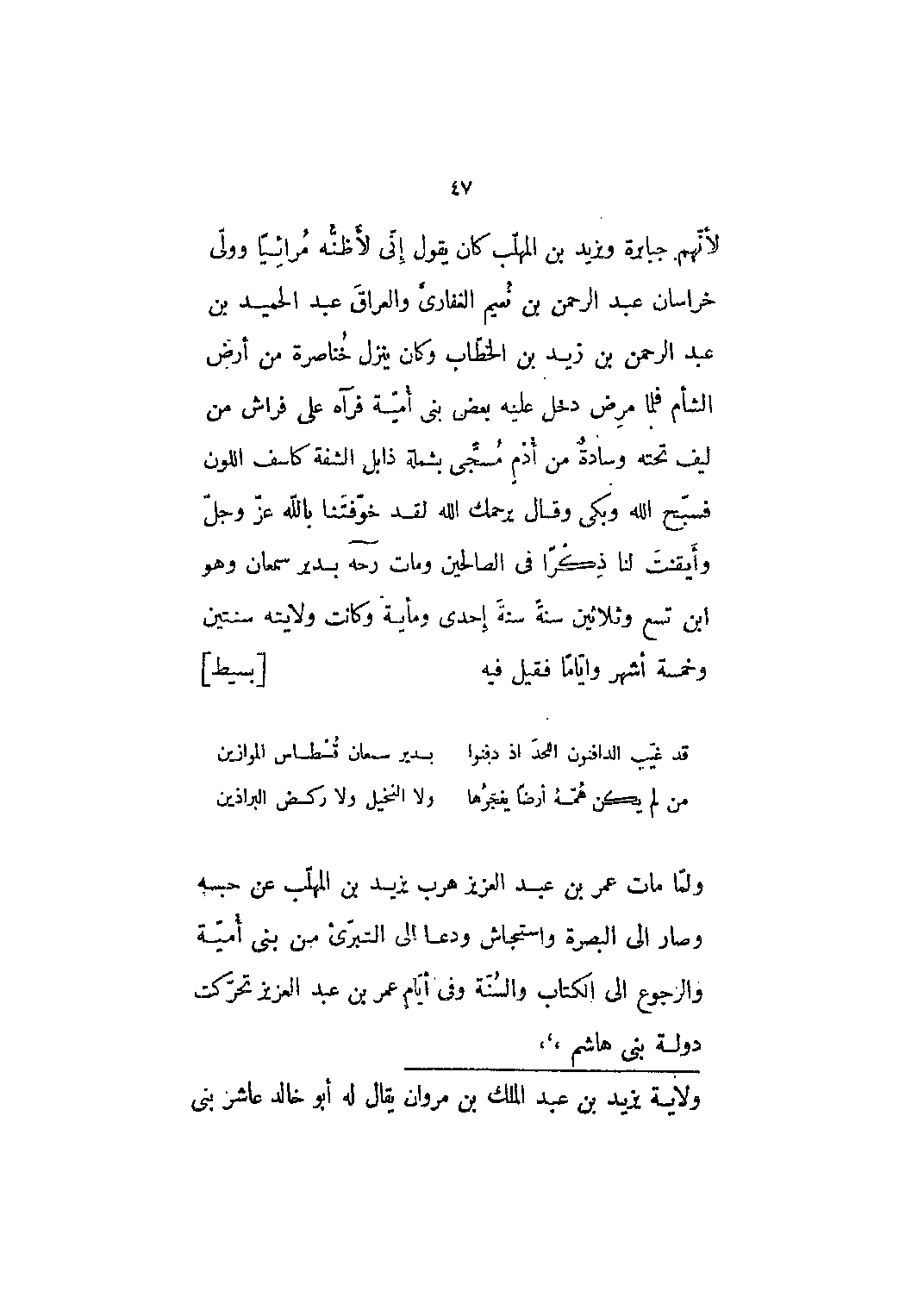لأنّهم جبابرة ويزيد بن المهلب كان يقول إني لأظنه مرائياً وولى خراسان عبد الرحمن بن نعيم الغفاري والعراق عبد الحميد بن عبد الرحمن بن زيد بن الخطاب وكان ينزل خناصرة من أرض الشام فلما مرض دخل عليه بعض بني أمية فرآه على فراش من ليف تحته وسادة من أدم مسجى بشملة ذابل الشفة كاسف اللون فسبح الله وبكى وقال يرحمك الله لقد خوفتنا باللَّه عز وجل وأيقنت لنا ذكراً في الصالحين ومات رحمه الله بدير سمعان وهو ابن تسع وثلاثين سنةً سنة إحدى ومائة وكانت ولايته سنتين وخمسة أشهر وأيّاما فقيل فيه [بسيط]