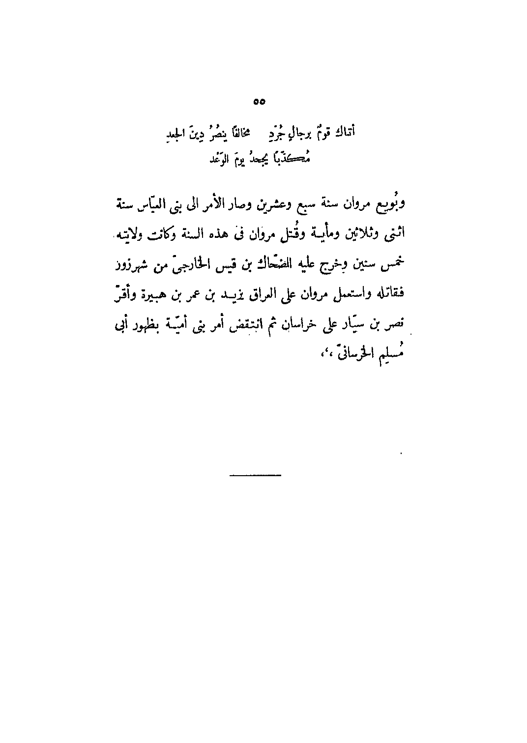 وبويع مروان سنة سبع وعشرين وصار الأمر إلى بني العباس سنة اثني وثلاثين ومائة وقتل مروان في هذه السنة وكانت ولايته خمس سنين وخرج عليه الضحاك بن قيس الخارجي من شهرزور فقاتله واستعمل مروان على العراق يزيد بن عمر بن هبيرة وأقر نصر بن سيّار على خراسان ثم انتقض أمر بنى أميّة بظهور أبى مسلم الخراسانىّ،،