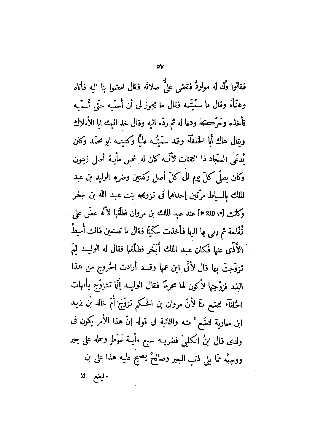 فقالوا ولد له مولد فقضى علي صلاته فقال امضوا بنا إليه فأتاه وهنأه وقال ما سميته فقال ما يجوز لي أن أسميه حتى تسميه فأخذه وحركه ودعا له ثم رده إليه وقال خذ إليك أبا الأملاك ويقال هاك أبا الخلفاء وقد سميته علياً وكنيته أبو محمد وكان يدعى السجّاد ذا الثفنات لأنّه كان له خمس مائة أصل زيتون وكان يصلي كل يوم إلى كل أصل ركعتين وضربه الوليد بن عبد الملك بالسياط مرتين إحداهما في تزويجه بنت عبد الله بن جعفر وكانت [F؟ 210 V؟] عند عبد الملك بن مروان فطلقها لأنه عض على تفاحة ثم رمى بها إليها فأخذت سكيناً فقال ما تصنعين قالت أميط الأذى عنها فكان عبد الملك أبخر فطلقها فقال له الوليد لم تزوجت بها قال لأني ابن عمها وقد أرادت الخروج من هذا البلد فزوجتها لأكون لها محرماً فقال الوليد إنما تتزوج بأمهات الخلفاء لتضع منا لأن مروان بن الحكم تزوج أم خالد بن يزيد ابن معاوية لتضع [1] منه والثانية في قوله إن هذا الأمر يكون في ولدي قال ابن الكلبي فضربه سبع مائة سوط وحمله على بعير ووجهه مما يلي ذنب البعير وصائح يصيح عليه هذا على بن
