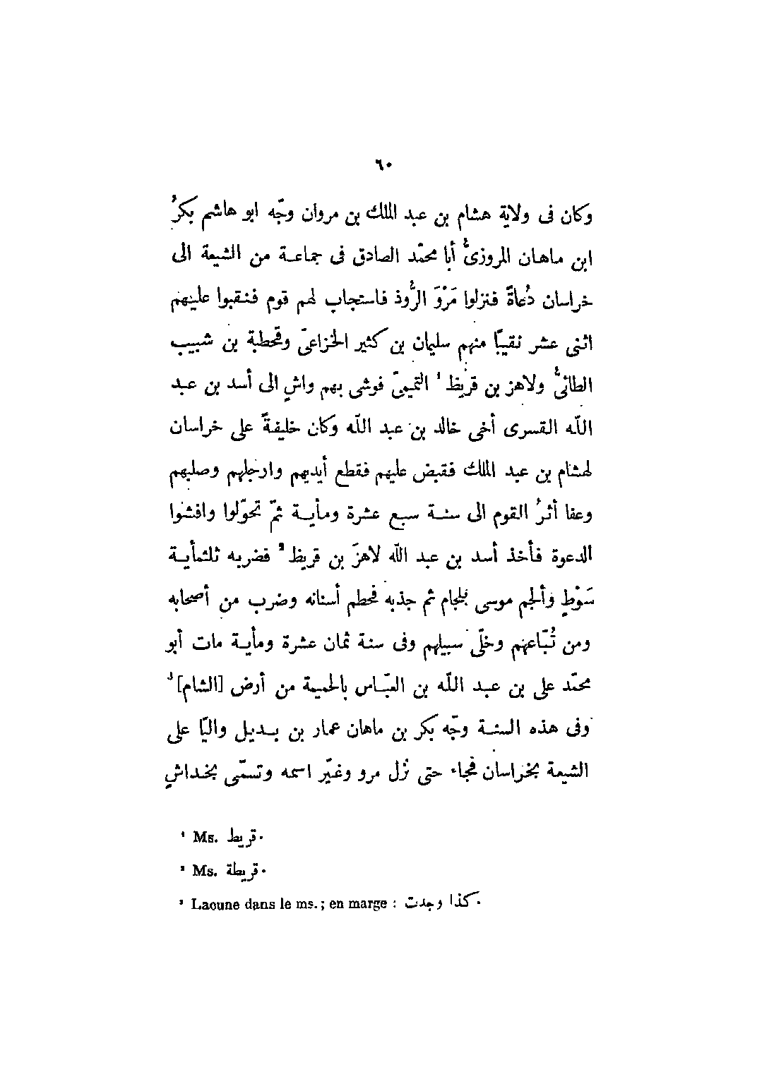 وكان في ولاية هشام بن عبد الملك بن مروان وجّه ابو هاشم بكر ابن ماهان المروزي أبا محمد الصادق في جماعة من الشيعة الى خراسان دعاة فنزلوا مروالرّوذ فاستجاب لهم قوم فنقبوا عليهم اثني عشر نقيبا منهم سليمان بن كثير الخزاعي وقحطبة بن شبيب الطائي ولاهز بن قريظ [1] التميمي فوشى بهم واشٍ إلى أسد بن عبد الله القسري أخي خالد بن عبد الله وكان خليفة على خراسان لهشام بن عبد الملك فقبض عليهم فقطع أيديهم وأرجلهم وصلبهم وعفا أثر القوم إلى سنة سبع عشرة ومائة ثم تحولوا وأفشوا الدعوة فأخذ أسد بن عبد الله لاهز بن قريظ [2] فضربه ثلاثمائة سوط وألجم موسى بلجام ثم جذبه فحطم أسنانه وضرب من أصحابه ومن تباعهم وخلى سبيلهم وفي سنة ثمان عشرة ومائة مات أبو محمد علي بن عبد الله بن العباس بالحميمة من أرض [الشام] [3] وفي هذه السنة وجه بكر بن ماهان عمار بن بديل واليا على الشيعة بخراسان فجاء حتى نزل مرو وغير اسمه وتسمى بخداش