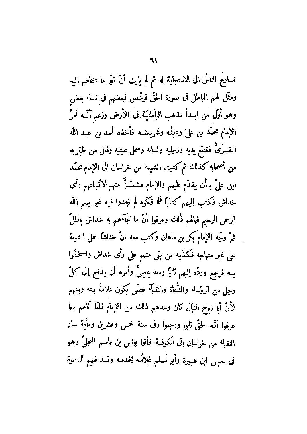 فسارع الناس إلى الاستجابة له ثم لم يلبث أن غير ما دعاهم إليه ومثل لهم الباطل في صورة الحق فرخص لبعضهم في نساء بعض وهو أول من أبدأ مذهب الباطنية في الأرض وزعم أنه أمر الإمام محمد بن علي ودينه وشريعته فأخذه أسد بن عبد الله القسري فقطع يديه ورجليه ولسانه وسمل عينيه وفعل من ظفر به من أصحابه كذلك ثم كتبت الشيعة من خراسان الى الإمام محمّد ابن علي بأن يقدم عليهم والإمام مشمئز منهم لاتباعهم رأي خداش فكتب إليهم كتاباً فلما فكوه لم يجدوا فيه غير بسم الله الرحمن الرحيم فهالهم ذلك وعرفوا أن ما جاءهم به خداش باطل ثم وجه الإمام بكر بن ماهان وكتب معه أن خداشاً حمل الشيعة على غير منهاجه فكذبه من بقي منهم على رأى خداش واستخفوا به فرجع ورده إليهم ثانياً ومعه عصىّ وأمره أن يدفع إلى كل رجل من الرؤساء والدعاة والنقباء عصىً يكون علامة بينه وبينهم لأن أبا رياح النبال كان وعدهم ذلك من الإمام فلما أتاهم بها عرفوا أنه الحق تابوا ورجعوا وفي سنة خمس وعشرين ومائة سار النقباء من خراسان إلى الكوفة فأتوا يونس بن عاصم العجلي وهو في حبس ابن هبيرة وأبو مسلم غلامه يخدمه وقد فهم الدعوة