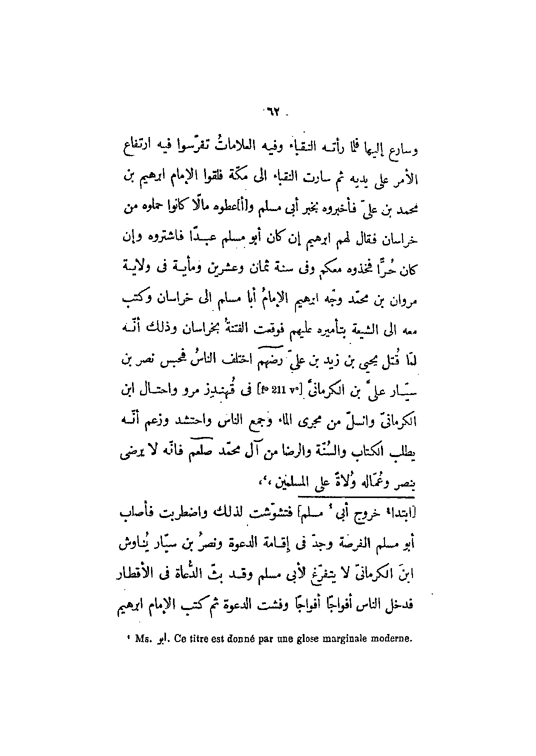 وسارع إليها فلما رأته النقباء وفيه العلامات تفرسوا فيه ارتفاع الأمر على يديه ثم سارت النقباء الى مكة فلقوا الإمام إبراهيم بن محمد بن علي فأخبروه بخبر أبي مسلم و [أ] عطوه مالاً كانوا حملوه من خراسان فقال لهم إبراهيم إن كان أبو مسلمٍ عبداً فاشتروه وإن كان حراً فخذوه معكم وفي سنة ثمان وعشرين ومائة في ولاية مروان بن محمد وجّه إبراهيم الإمام أبا مسلم إلى خراسان وكتب معه إلى الشيعة بتأميره عليهم فوقعت الفتنة بخراسان وذلك أنه لما قتل يحيى بن زيد بن علي رضي الله عنهم اختلف الناس فحبس نصر بن سيار علي بن الكرماني [F؟ 211 V؟] في قهندز مرو واحتال ابن الكرماني وانسل من مجرى الماء وجمع الناس واحتشد وزعم أنه يطلب الكتاب والسنة والرضا من آل محمد صلى الله عليه وسلم فإنه لا يرضى بنصر وعماله ولاة على المسلمين،،،