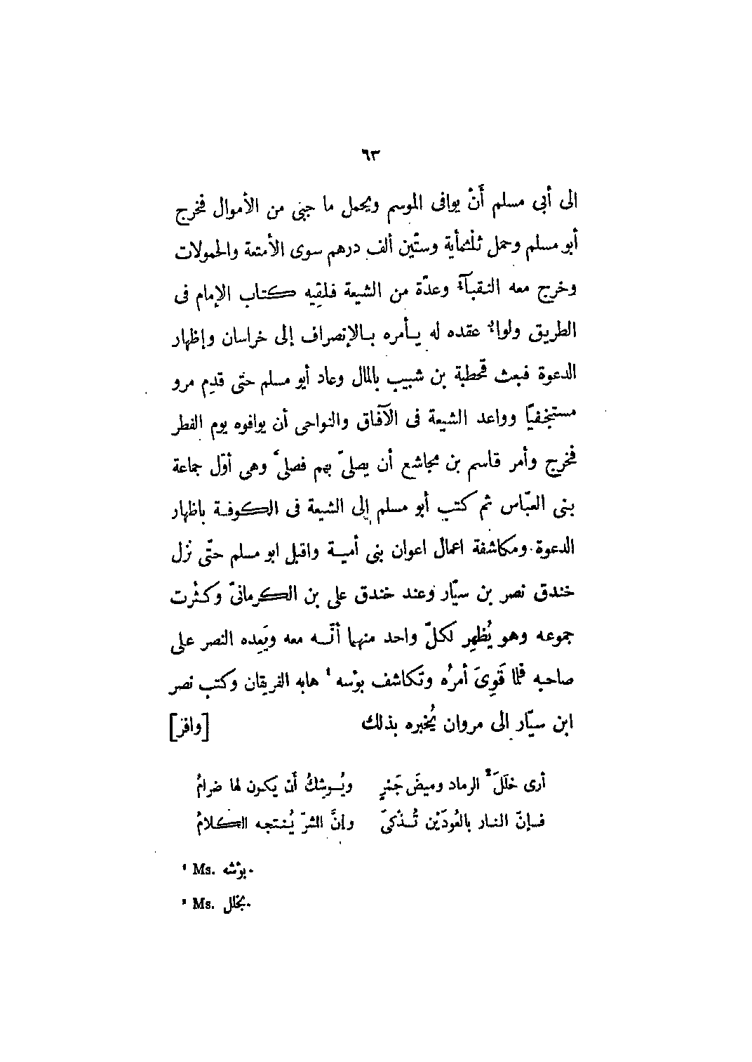إلى أبي مسلم أن يوافي الموسم ويحمل ما جبى من الأموال فخرج أبو مسلم وحمل ثلاثمائة وستين ألف درهم سوى الأمتعة والحمولات وخرج معه النقباء وعدة من الشيعة فلقيه كتاب الإمام في الطريق ولواء عقده له يأمره بالانصراف إلى خراسان وإظهار الدعوة فبعث قحطبة بن شبيب بالمال وعاد أبو مسلم حتى قدم مرو مستخفيا وواعد الشيعة في الآفاق والنواحي أن يوافوه يوم الفطر فخرج وأمر قاسم بن مجاشع أن يصلّى بهم فصلّى وهي أول جماعة بني العباس ثم كتب أبو مسلم إلى الشيعة في الكوفة بإظهار الدعوة ومكاشفة أعمال أعوان بني أمية وأقبل أبو مسلم حتى نزل خندق نصر بن سيار وعند خندق علي بن الكرماني وكثرت جموعه وهو يظهر لكلّ واحد منهما أنه معه ويعده النصر على صاحبه فلما قوي أمره وتكاشف بؤسه [1] هابه الفريقان وكتب نصر ابن سيّار الى مروان يخبره بذلك [وافر]