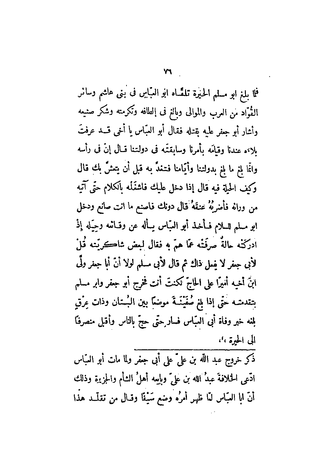 فلما بلغ أبو مسلم الحيرة تلقاه أبو العباس في بني هاشم وسائر القواد من العرب والموالي وبالغ في إلطافه وتكرمته وشكر صنيعه وأشار أبو جعفر عليه بقتله فقال أبو العباس يا أخي قد عرفت بلاءه عندنا وقيامه بأمرنا وسابقته في دولتنا قال إن في رأسه وإنما بلغ ما بلغ بدولتنا وأيامنا فتغد به قبل أن يتعش بك قال وكيف الحيلة فيه قال إذا دخل عليك فاشغله بالكلام حتى آتيه من ورائه فأضربه عنقه قال دونك فاصنع ما أنت صانع ودخل أبو مسلم للسلام فأخذ أبو العباس يسأله عن وقائعه وحيله إذ أدركته حالة صرفته عما هم به فقال لبعض شاكريته قل لأبي جعفر لا يفعل ذاك ثم قال لأبي مسلم لولا أن أبا جعفر ولى ابن أخيه أميراً على الحاج لكنت أنت فخرج أبو جعفر وأبو مسلم بتقدمته حتى إذا بلغ صفينة موضعاً بين البستان وذات عرق بلغه خبر وفاة أبي العباس فسار حتى حج بالناس وأقبل منصرفاً الى الحيرة،،،