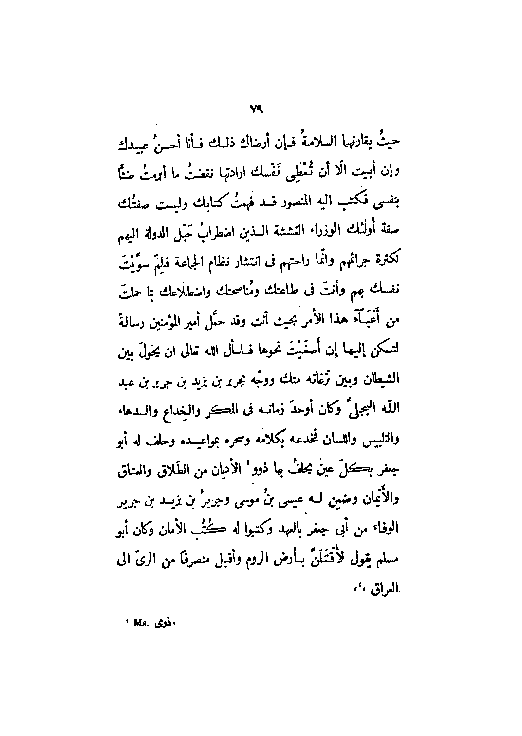 حيث يقارنهما السلامة فإن أرضاك ذلك فأنا أحسن عبيدك وإن أبيت الّا أن تعطي نفسك إرادتها نقضت ما أبرمت ضناً بنفسي فكتب إليه المنصور قد فهمت كتابك وليست صفتك صفة أولئك الوزراء الغششة الذين اضطراب حبل الدولة إليهم لكثرة جرائمهم وإنما راحتهم في انتشار نظام الجماعة فلم سويت نفسك بهم وأنت في طاعتك ومناصحتك واضطلاعك بما حملت من أعباء هذا الأمر بحيث أنت وقد حمل أمير المؤمنين رسالة لتسكن إليها إن أصغيت نحوها فاسأل الله تعالى أن يحول بين الشيطان وبين نزغاته منك ووجه بجرير بن يزيد بن جرير بن عبد الله البجلي وكان أوحد زمانه في المكر والخداع والدهاء والتلبيس واللسان فخدعه بكلامه وسحره بمواعيده وحلف له أبو جعفر بكل عين يحلف بها ذوو [1] الأديان من الطلاق والعتاق والأيمان وضمن له عيسى بن موسى وجرير بن يزيد بن جرير الوفاء من أبي جعفر بالعهد وكتبوا له كتب الأمان وكان أبو مسلم يقول لأقتلن بأرض الروم وأقبل منصرفاً من الري إلى العراق،،،
