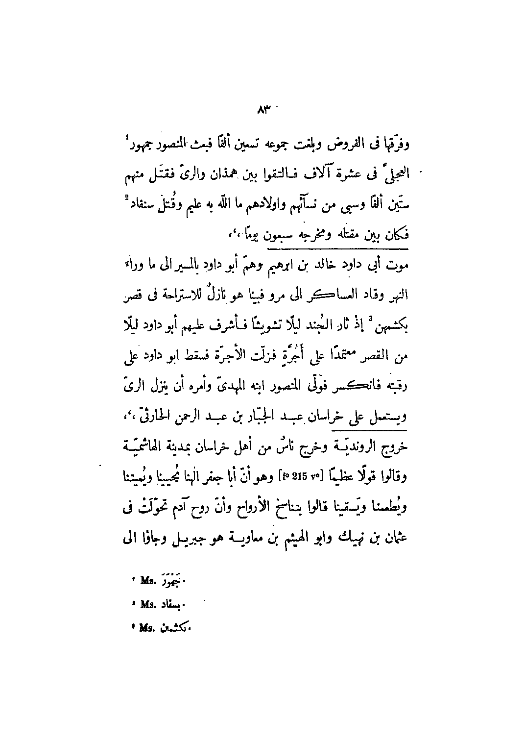 وخرج ناس من أهل خراسان بمدينة الهاشمية وقالوا قولاً عظيما [F؟ 215 V؟] وهو أنّ أبا جعفر الهنا يحيينا ويميتنا ويطعمنا ويسقينا قالوا بتناسخ الأرواح وأن روح آدم تحولت في عثمان بن نهيك وأبو الهيثم بن معاوية هو جبريل وجاءوا الى