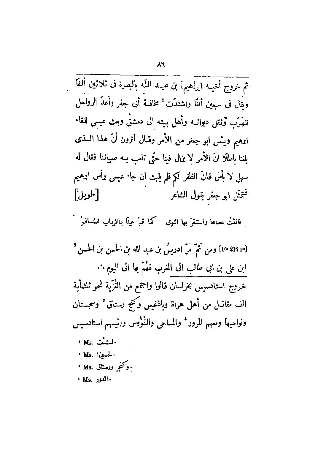 [F؟ 216 r؟] ومن ثم مر إدريس بن عبد الله بن الحسن بن الحسن [2] ابن علي بن أبي طالب إلى المغرب فهم بها الى اليوم،،،