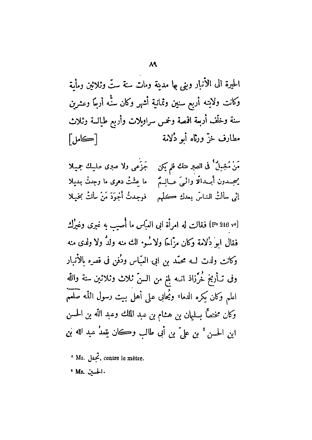 [F؟ 216 V؟] فقالت له امرأة أبي العباس ما أصيب به غيري وغيرك فقال أبو دلامة وكان مزاحاً ولا سوء لك منه ولد ولا ولدي منه وكانت ولدت له محمد بن أبي العباس ودفن في قصره بالأنبار وفي تأريخ خرّزاذ أنه بلغ من السن ثلاث وثلاثين سنة والله أعلم وكان يكره الدماء ويحابي على أهل بيت رسول الله صلى الله عليه وسلم وكان مختصّا بسليمان بن هشام بن عبد الملك وعبد الله بن الحسن ابن الحسن [2] بن علي بن أبي طالب وكان يقعد عبد الله بن