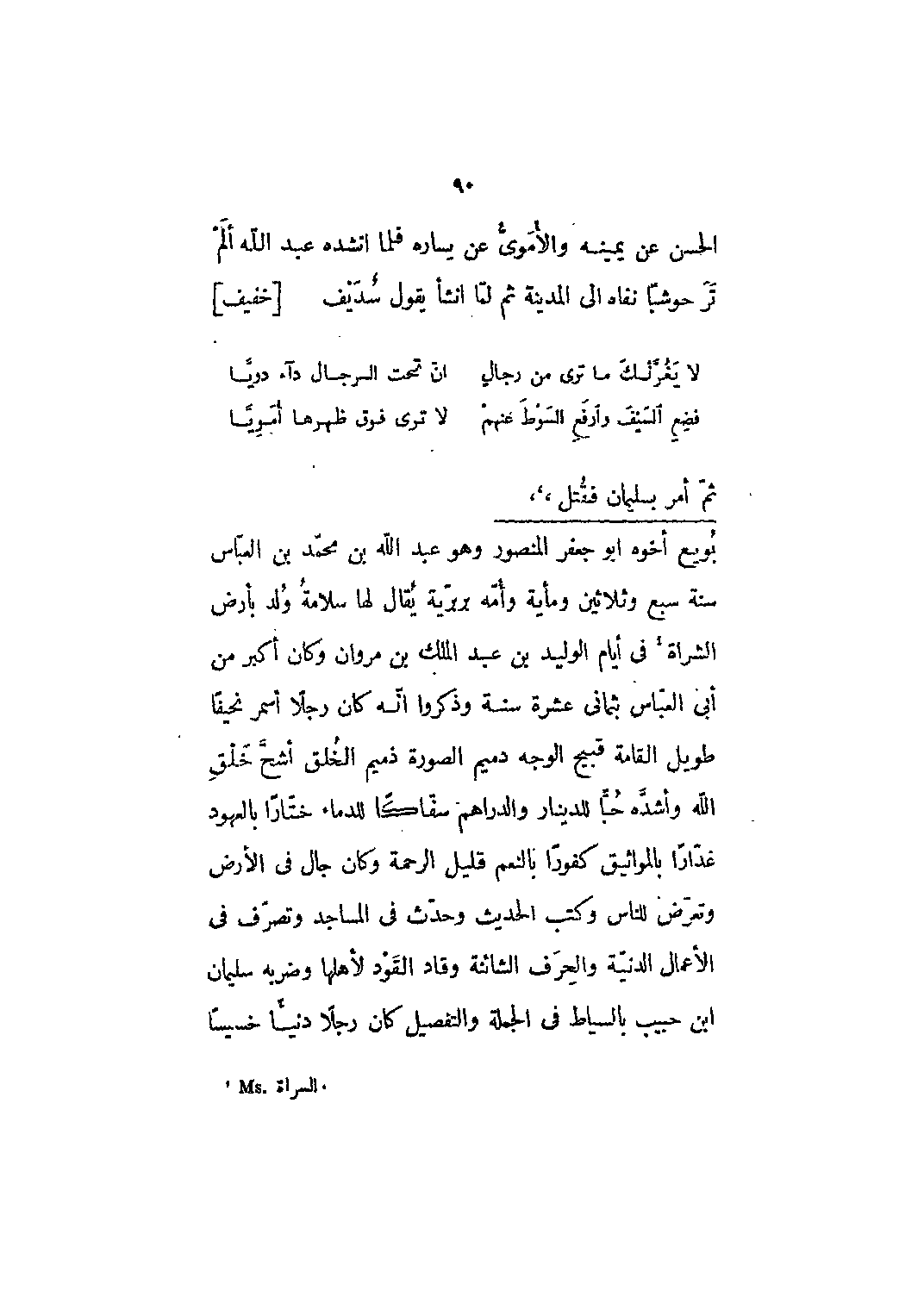 وهو عبد الله بن محمد بن العباس سنة سبع وثلاثين ومائة وأمه بربرية يقال لها سلامة ولد بأرض الشراة [1] في أيام الوليد بن عبد الملك بن مروان وكان أكبر من أبي العباس بثماني عشرة سنة وذكروا أنه كان رجلاً أسمر نحيفاً طويل القامة قبيح الوجه دميم الصورة ذميم الخلق أشح خلق الله وأشده حباً للدينار والدراهم سفاكاً للدماء ختاراً بالعهود غداراً بالمواثيق كفوراً بالنعم قليل الرحمة وكان جال في الأرض وتعرض للناس وكتب الحديث وحدث في المساجد وتصرف في الأعمال الدنية والحرف الشائنة وقاد القود لأهلها وضربه سليمان ابن حبيب بالسياط في الجملة والتفصيل كان رجلا دنيا خسيسا