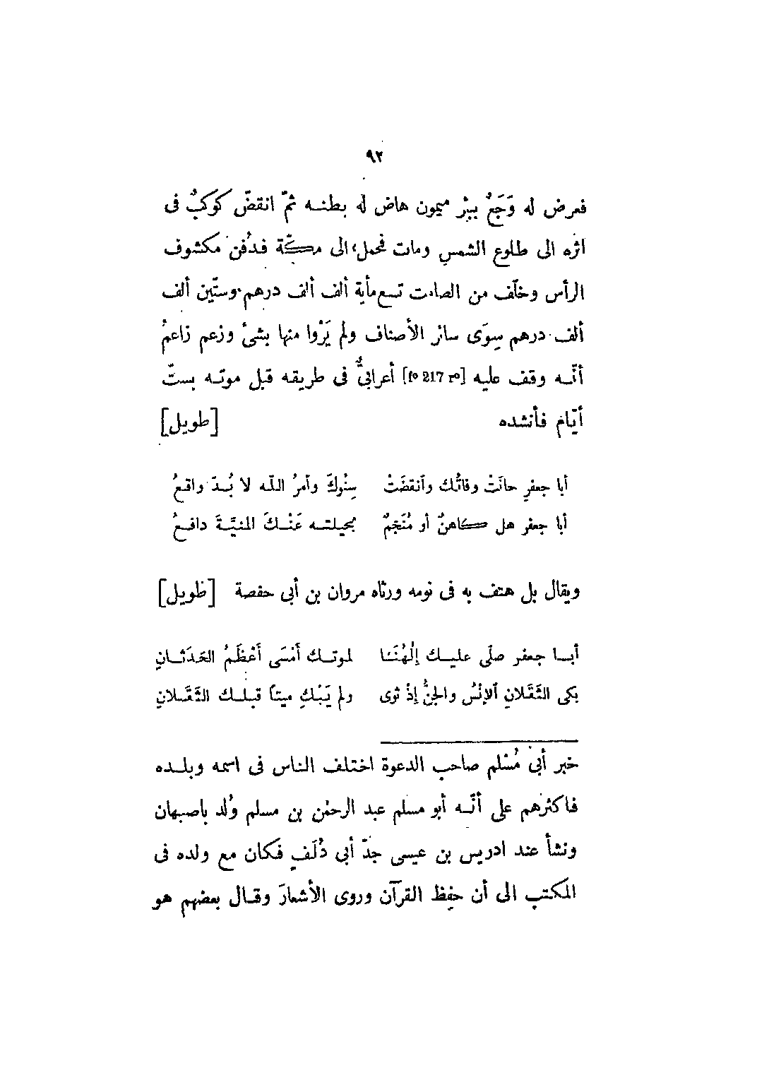 فعرض له وجع ببئر ميمون هاض له بطنه ثم انقض كوكب في إثره إلى طلوع الشمس ومات فحمل إلى مكة فدفن مكشوف الرأس وخلف من الصامت تسع مائة ألف ألف درهم وستين ألف ألف درهم سوى سائر الأصناف ولم يروا منها بشيء وزعم زاعم أنه وقف عليه [F؟ 217 r؟] أعرابي في طريقه قبل موته بستّ أيّام فأنشده [طويل]