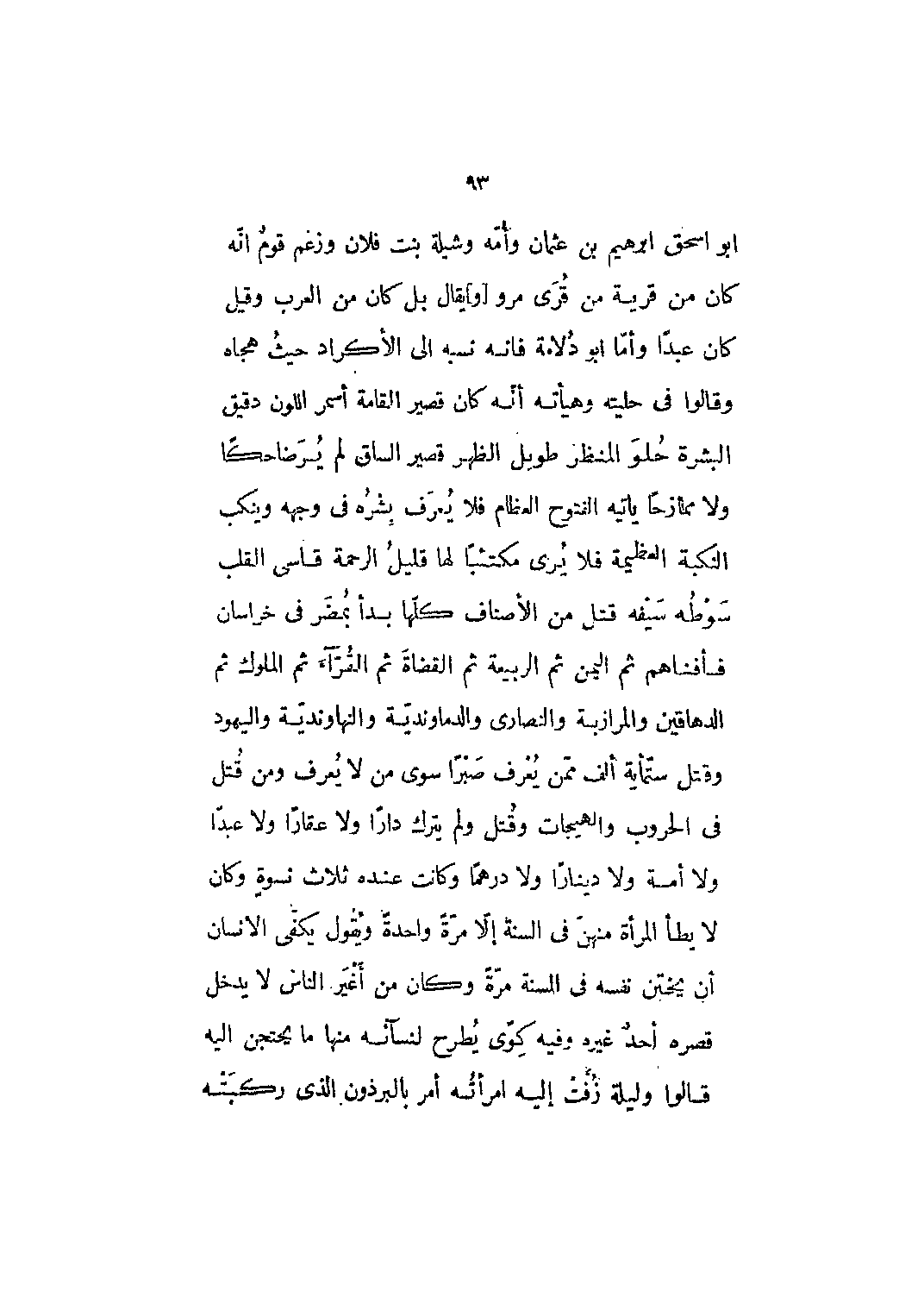 ابو إسحاق إبراهيم بن عثمان وأمه وشيلة بنت فلان وزعم قوم أنه كان من قرية من قرى مرو [و] يقال بل كان من العرب وقيل كان عبداً وأما أبو دلامة فإنه نسبه إلى الأكراد حيث هجاه وقالوا في حليته وهيأته أنه كان قصير القامة أسمر اللون دقيق البشرة حلو المنظر طويل الظهر قصير الساق لم ير ضاحكاً ولا ممازحاً يأتيه الفتوح العظام فلا يعرف بشره في وجهه وينكب النكبة العظيمة فلا يرى مكتئباً لها قليل الرحمة قاسي القلب سوطه سيفه قتل من الأصناف كلها بدأ بمضر في خراسان فأفناهم ثم اليمن ثم الربيعة ثم القضاة ثم القراء ثم الملوك ثم الدهاقين والمرازبة والنصارى والدماوندية والنهاوندية واليهود وقتل ستمائة ألف ممن يعرف صبراً سوى من لا يعرف ومن قتل في الحروب والهيجاء وقتل ولم يترك داراً ولا عقاراً ولا عبداً ولا أمةً ولا ديناراً ولا درهماً وكانت عنده ثلاث نسوة وكان لا يطأ المرأة منهن في السنة إلا مرة واحدة ويقول يكفي الإنسان أن يختن نفسه في السنة مرة وكان من أغير الناس لا يدخل قصره أحد غيره وفيه كوى يطرح لنسائه منها ما يحتجن إليه قالوا وليلة زفت إليه أمرأته أمر بالبرذون الذي ركبته