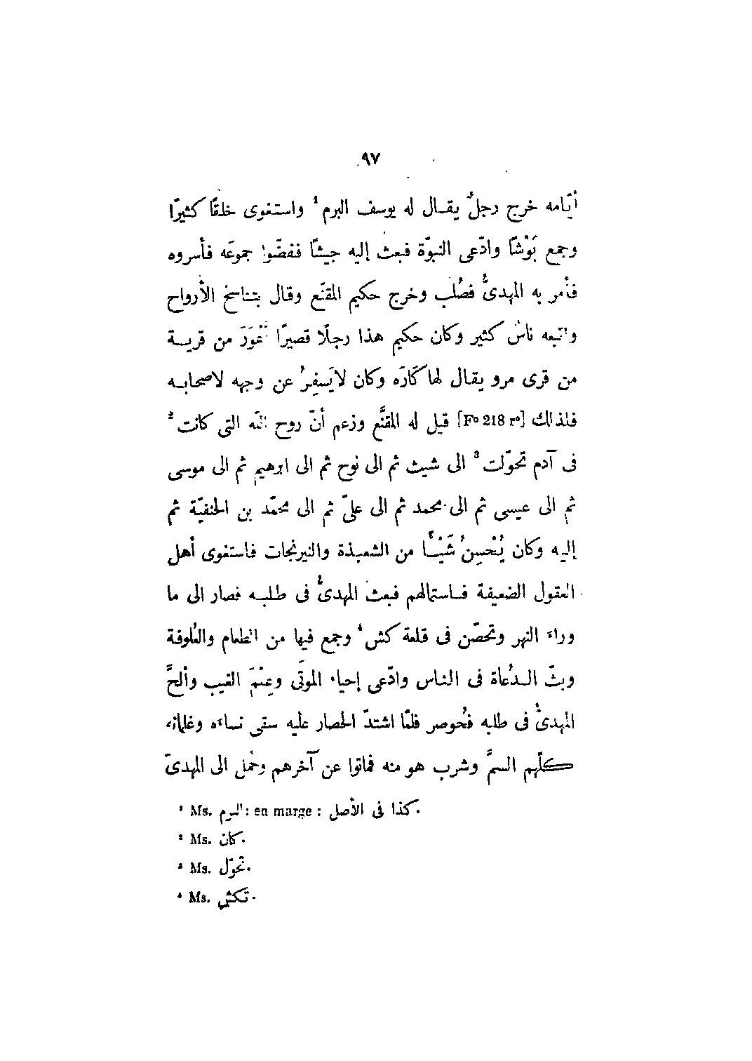 أيامه خرج رجل يقال له يوسف البرم [1] واستغوى خلقاً كثيراً وجمع بوشا وأدعى النبوة فبعث إليه جيشاً ففضوا جموعه فأسروه فأمر به المهدي فصلب وخرج حكيم المقنع وقال بتناسخ الأرواح واتبعه ناس كثير وكان حكيم هذا رجلاً قصيراً أعور من قرية من قرى مرو يقال لها كاره وكان لا يسفر عن وجهه لأصحابه فلذلك [F؟ 218 r؟] قيل له المقنع وزعم أن روح الله التي كانت [2] في آدم تحولت [3] إلى شيث ثم إلى نوح ثم الى إبراهيم ثم إلى موسى ثم إلى عيسى ثم الى محمد ثم الى على ثم إلى محمد بن الحنفية ثم إليه وكان يحسن شيئاً من الشعبذة والنيرنجات فاستغوى أهل العقول الضعيفة فاستمالهم فبعث المهدي في طلبه فصار إلى ما وراء النهر وتحصن في قلعة كش [4] وجمع فيها من الطعام والعلوفة وبث الدعاة في الناس وادعى إحياء الموتى وعلم الغيب وألح المهدي في طلبه فحوصر فلما اشتد الحصار عليه سقى نساءه وغلمانه كلهم السم وشرب هو منه فماتوا عن آخرهم وحمل الى المهدىّ