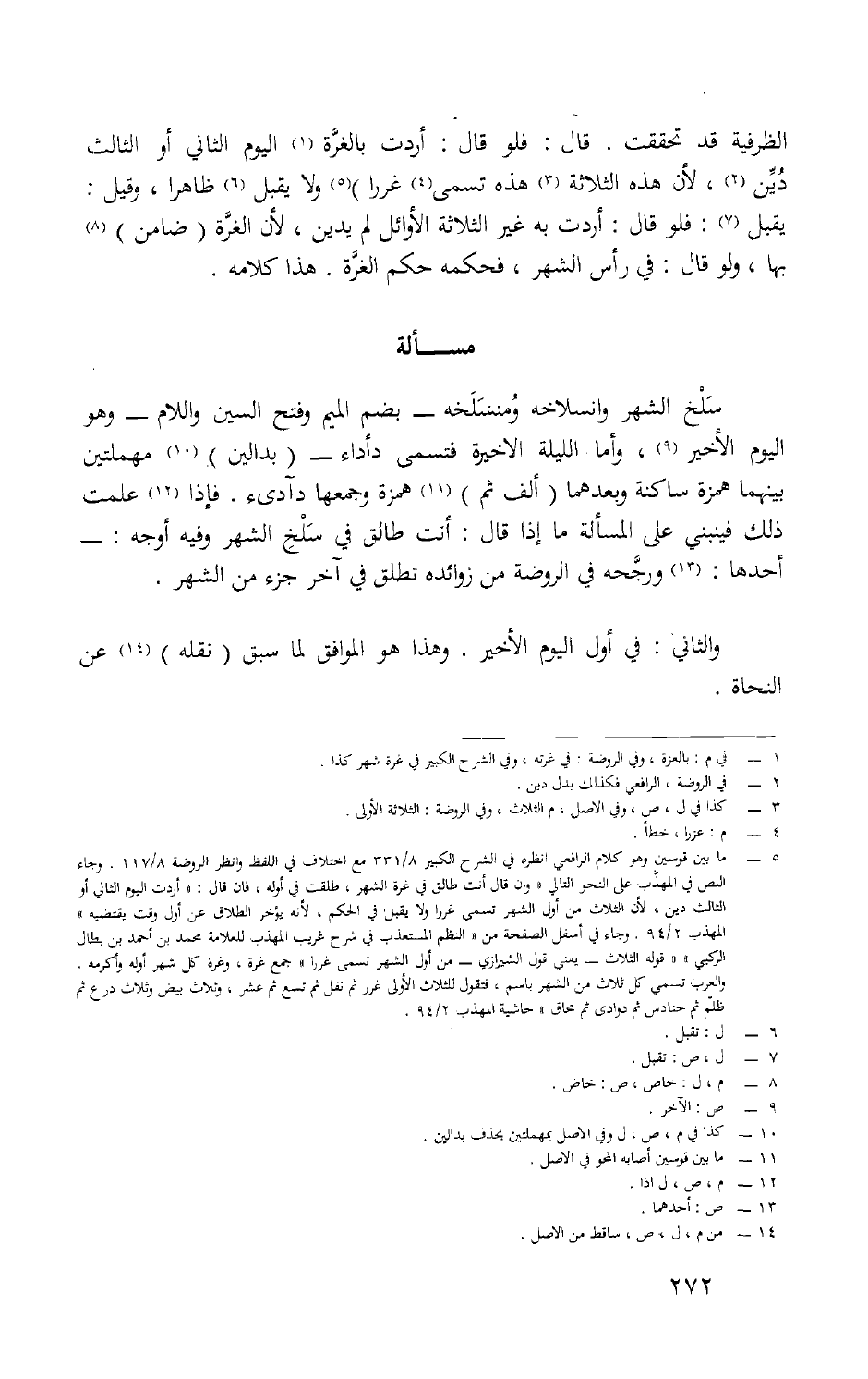 سلخ الشَّهْر وانسلاخه ومنسلخه بِضَم الْمِيم وَفتح السِّين وَاللَّام وَهُوَ الْيَوْم الْأَخير وَأما اللَّيْلَة الْأَخِيرَة فتسمى دأداء بدالين مهملتين بَينهمَا همزَة سَاكِنة وبعدهما (ألف ثمَّ) همزَة وَجَمعهَا دآدىء فَإِذا علمت ذَلِك فينبني على الْمَسْأَلَة مَا إِذا قَالَ أَنْت طَالِق فِي سلخ الشَّهْر وَفِيه أوجه أَحدهَا وَرجحه فِي الرَّوْضَة من زوائده تطلق فِي آخر جزة من الشَّهْر