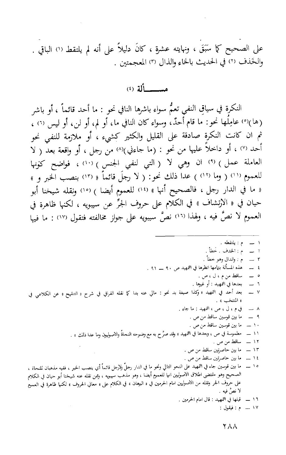 النكرَة فِي سِيَاق النَّفْي تعم سواءباشرها النَّافِي نَحْو مَا أحد قَائِما أَو بَاشر هَا عاملها نَحْو مَا قَامَ أحد وَسَوَاء كَانَ النَّافِي مَا أَو لم أَو لن أَو لَيْسَ ثمَّ إِن كَانَت النكرَة صَادِقَة على الْقَلِيل وَالْكثير كشيء أَو مُلَازمَة للنَّفْي نَحْو أحد أَو دَاخِلا عَلَيْهَا من نَحْو (مَا جَاءَنِي) من رجل أَو وَاقعَة بعد (لَا العاملة عمل) إِن وَهِي لَا (الَّتِي لنفي الْجِنْس) فَوَاضِح كَونهَا للْعُمُوم وَمَا عدا ذَلِك نَحْو لَا رجل قَائِما بِنصب الْخَبَر وَمَا فِي الدَّار رجل فَالصَّحِيح أَنَّهَا للْعُمُوم أَيْضا وَنَقله شَيخنَا أَبُو حَيَّان فِي الارتشاف فِي الْكَلَام على حُرُوف الْجَرّ عَن سِيبَوَيْهٍ لَكِنَّهَا ظَاهِرَة فِي الْعُمُوم لَا نَص فِيهِ وَلِهَذَا نَص سِيبَوَيْهٍ على جَوَاز مخافته فَتَقول مَا فِيهَا