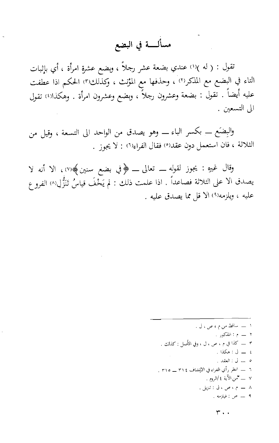 تَقول لَهُ عِنْدِي بضعَة عشر رجلا وبضع عشرَة امْرَأَة أَي بِإِثْبَات التَّاء فِي الْبضْع مَعَ الْمُذكر وحذفها مَعَ الْمُؤَنَّث وَكَذَلِكَ الحكم إِذا عطفت عَلَيْهِ أَيْضا تَقول بضعَة وَعِشْرُونَ رجلا وبضع وَعِشْرُونَ امْرَأَة وَهَكَذَا تَقول إِلَى التسعين