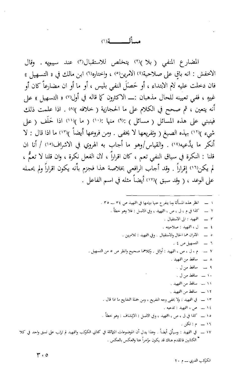 الْمُضَارع الْمَنْفِيّ (بِلَا) يتَخَلَّص للاستقبال عِنْد سِيبَوَيْهٍ وَقَالَ الْأَخْفَش إِنَّه بَاقٍ على صَلَاحِية الْأَمريْنِ وَاخْتَارَهُ ابْن مَالك فِي التسهيل فَإِن دخلت عَلَيْهِ لَام الِابْتِدَاء أَو حصل النَّفْي بليس أَو مَا أَو إِن مضارعا كَانَ أَو غَيره فَفِي تَعْيِينه للْحَال مذهبان الْأَكْثَرُونَ كَمَا قَالَه فِي أول التسهيل على أَنه يتَعَيَّن ثمَّ صحّح فِي الْكَلَام على مَا الحجازية (خِلَافه) إِذا علمت ذَلِك فينبني على هَذِه الْمسَائِل مسَائِل مِنْهَا مَا إِذا حلف على شَيْء بِهَذِهِ الصِّيَغ وتفريعها لَا يخفى وَمن فروعها أَيْضا مَا إِذا قَالَ لَا أنكر مَا يَدعِيهِ وَالْقِيَاس وَهُوَ مَا أجَاب بِهِ الْهَرَوِيّ فِي الاشراف أَنا إِن قُلْنَا النكرَة فِي سِيَاق النَّفْي تعم كَانَ إِقْرَارا لِأَن الْفِعْل نكره وَإِن قُلْنَا لَا تعم لم يكن إِقْرَارا وَقد أجَاب الرَّافِعِيّ بخلاصة هَذَا فَجزم بِأَنَّهُ يكون إِقْرَارا وَلم يحملهُ على الْوَعْد وَقد سبق أَيْضا مثله فِي اسْم الْفَاعِل