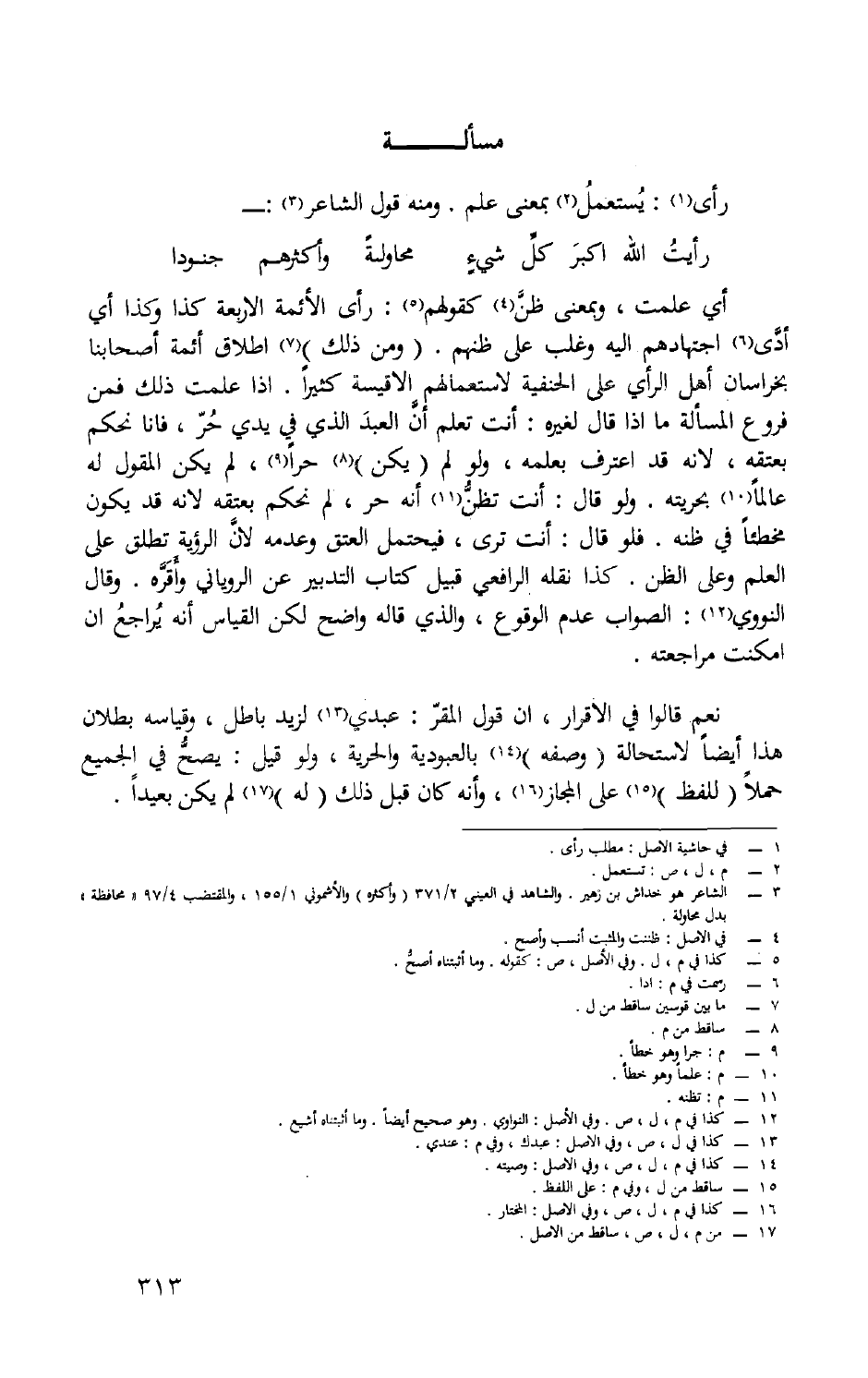 أَي علمت وَبِمَعْنى ظن كَقَوْلِهِم رأى الْأَئِمَّة الْأَرْبَعَة كَذَا وَكَذَا أَي أدّى اجتهادهم إِلَيْهِ وَغلب على ظنهم وَمن ذَلِك إِطْلَاق أَئِمَّة أَصْحَابنَا بخراسان أهل الرَّأْي على الْحَنَفِيَّة لاستعمالهم الأقيسة كثيرا إِذا علمت ذَلِك فَمن فروع الْمَسْأَلَة مَا إِذا قَالَ لغيره أَنْت تعلم أَن العَبْد الَّذِي فِي يَدي حر فَأَنا نحكم بِعِتْقِهِ لِأَنَّهُ قد اعْترف بِعِلْمِهِ وَلَو لم يكن حرا لم يكن الْمَقُول لَهُ عَالما بحريَّته وَلَو قَالَ أَنْت تظن أَنه حر لم نحكم بِعِتْقِهِ لِأَنَّهُ قد يكون مخطئا فِي ظَنّه فَلَو قَالَ أَنْت ترى فَيحْتَمل الْعتْق وَعَدَمه لِأَن الرُّؤْيَة تطلق على الْعلم وعَلى الظَّن كَذَا نَقله الرَّافِعِيّ قبيل كتاب التَّدْبِير عَن الرَّوْيَانِيّ وَأقرهُ وَقَالَ النَّوَوِيّ الصَّوَاب عدم الْوُقُوع وَالَّذِي قَالَه وَاضح لَكِن الْقيَاس أَنه يُرَاجع إِن أمكنت مُرَاجعَته