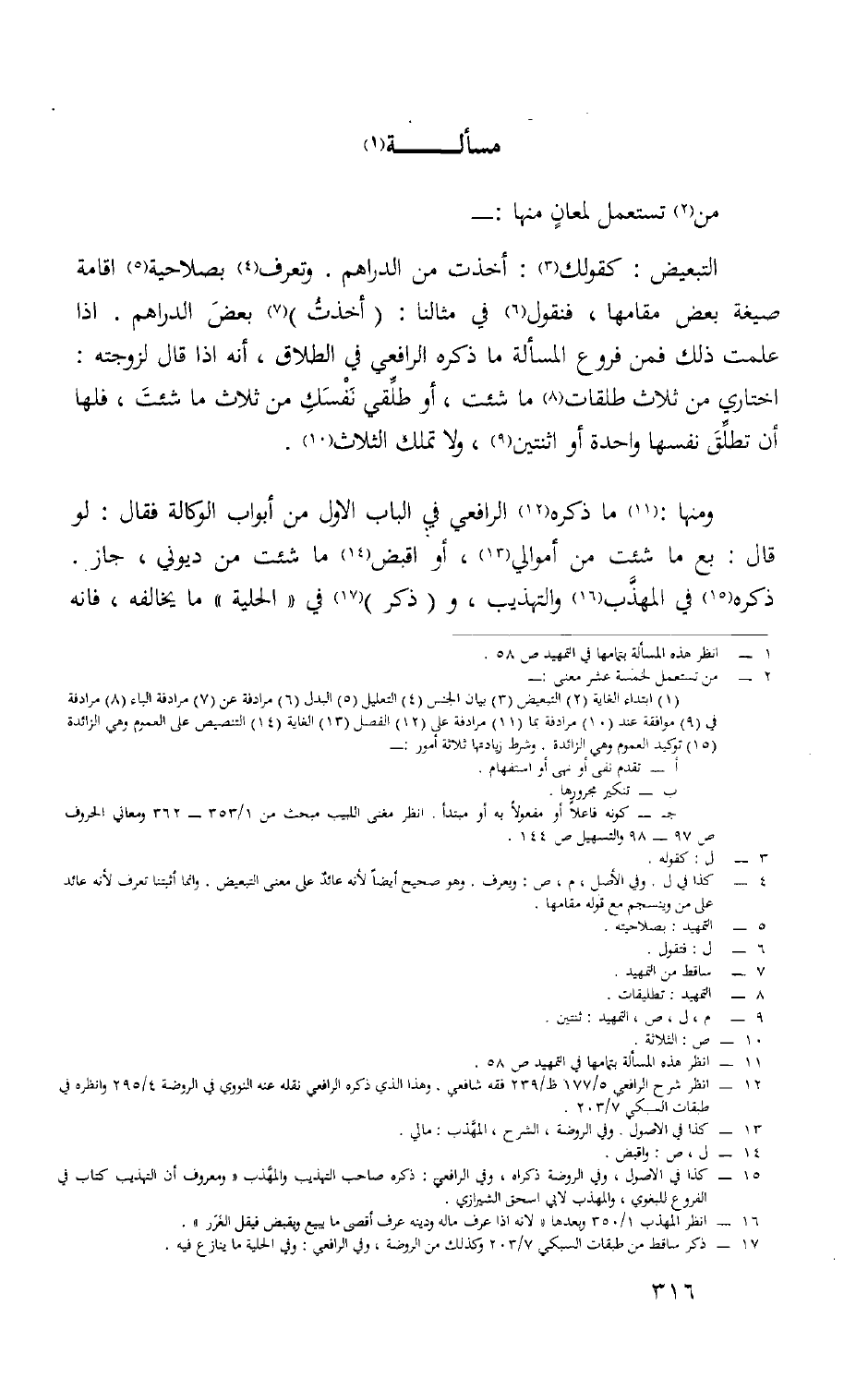 التَّبْعِيض كَقَوْلِك أخذت من الدَّرَاهِم وتعرف بصلاحية إِقَامَة صِيغَة بعض مقَامهَا فَنَقُول فِي مثالنا أخذت بعض الدَّرَاهِم إِذا علمت ذَلِك فَمن فروع الْمَسْأَلَة مَا ذكره الرَّافِعِيّ فِي الطَّلَاق أَنه إِذا قَالَ لزوجته اخْتَارِي من ثَلَاث طلقات مَا شِئْت أَو طَلِّقِي نَفسك من ثَلَاث مَا شِئْت فلهَا أَن تطلق نَفسهَا وَاحِدَة أَو اثْنَتَيْنِ وَلَا تملك الثَّلَاث