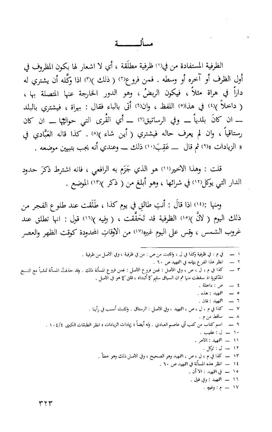 الظرفيه المستفادة من فِي ظرفية مُطلقَة أَي لَا إِشْعَار لَهَا يكون المظروف فِي أول الظّرْف أَو آخِره أَو وَسطه فَمن فروع ذَلِك إِذا وَكله أَن يَشْتَرِي لَهُ دَارا فِي هراة مثلا فَيكون الربض وَهُوَ الدّور الْخَارِجَة عَنْهَا الْمُتَّصِلَة بهَا دَاخِلا فِي هَذَا اللَّفْظ وَإِن أَتَى بِالْبَاء فَقَالَ بهراة فيشتري بِالْبَلَدِ إِن كَانَ بلديا وَفِي الرساتيق أَي الْقرى الَّتِي حواليها إِن كَانَ رستاقيا وَإِن لم يعرف حَاله فيشتري أَيْن شَاءَ كَذَا قَالَه الْعَبَّادِيّ فِي الزِّيَادَات ثمَّ قَالَ عقب ذَلِك وَعِنْدِي أَنه يجب بتبيين موصعه
