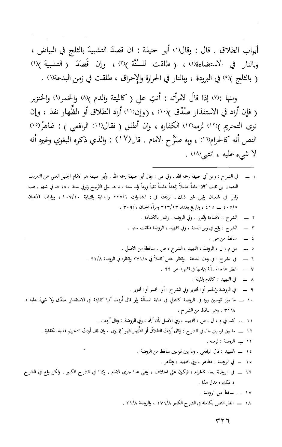 أَبْوَاب الطَّلَاق قَالَ وَقَالَ أبوحنيفة إِن قصد التَّشْبِيه بالثلج فِي الْبيَاض وبالنار فِي الاستضاءة (طلقت للسّنة) وَإِن قصد التَّشْبِيه بالثلج فِي الْبُرُودَة وبالنار فِي الْحَرَارَة والإحراق طلقت فِي زمن الْبِدْعَة