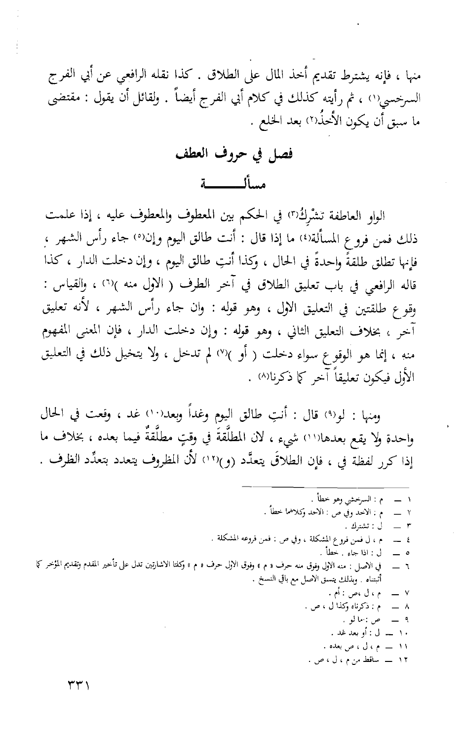 مِنْهَا فَإِنَّهُ يشْتَرط تَقْدِيم أَخذ المَال على الطَّلَاق كَذَا نَقله الرَّافِعِيّ عَن أبي الْفرج السَّرخسِيّ ثمَّ رَأَيْته كَذَلِك فِي كَلَام أبي الْفرج أَيْضا وَلقَائِل أَن يَقُول مُقْتَضى مَا سبق أَن يكون الْأَخْذ بعد الْخلْع