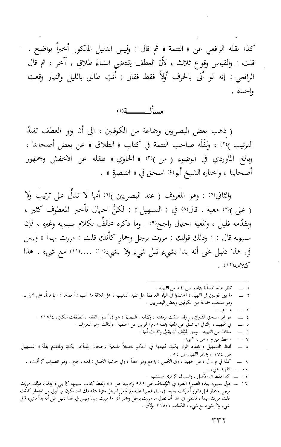 ذهب بعض الْبَصرِيين وَجَمَاعَة من الْكُوفِيّين إِلَى أَن وَاو الْعَطف تفِيد التَّرْتِيب وَنَقله صَاحب التَّتِمَّة فِي كتاب الطَّلَاق عَن بعض أَصْحَابنَا وَبَالغ الْمَاوَرْدِيّ فِي الْوضُوء من الْحَاوِي فنقله عَن الْأَخْفَش وَجُمْهُور أَصْحَابنَا وَاخْتَارَهُ الشَّيْخ أَبُو اسحق فِي التَّبْصِرَة