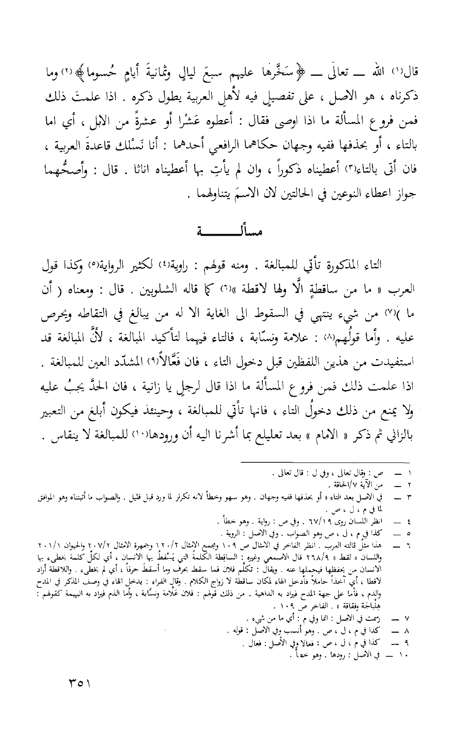 التَّاء الْمَذْكُورَة تَأتي للْمُبَالَغَة وَمِنْه قَوْلهم راوية لكثير الرِّوَايَة وَكَذَا قَول الْعَرَب مَا من سَاقِطَة إِلَّا وَلها لاقطة كَمَا قَالَه الشلوبين قَالَ وَمَعْنَاهُ أَن مَا من شَيْء يَنْتَهِي فِي السُّقُوط إِلَى الْغَايَة إِلَّا لَهُ من يُبَالغ فِي الْتِقَاطه ويحرض عَلَيْهِ وَأما قَوْلهم عَلامَة ونسابة فالتاء فيهمَا لتأكيد الْمُبَالغَة لِأَن الْمُبَالغَة قد استفيدت من هذَيْن اللَّفْظَيْنِ قبل دُخُول التَّاء فَإِنَّهَا تَأتي للْمُبَالَغَة وَحِينَئِذٍ فَيكون أبلغ من التَّعْبِير بالزاني ثمَّ ذكر الإِمَام بعد تَعْلِيل بِمَا أَشَرنَا إِلَيْهِ أَن وُرُودهَا للْمُبَالَغَة لَا ينقاس