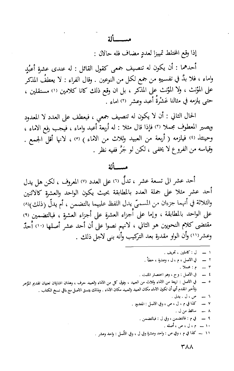 أَحدهمَا أَن يكون لَهُ تنصيف جمعي كَقَوْل الْقَائِل لَهُ عِنْدِي عشرَة أعبد وإماء فَلَا بُد فِي تَفْسِيره من جمع لكل من النَّوْعَيْنِ وَقَالَ الْفراء لَا يعْطف الْمُذكر على الْمُؤَنَّث وَلَا الْمُؤَنَّث على الْمُذكر بل إِن وَقع ذَلِك كَانَا كلامين مستقلين حَتَّى يلْزمه فِي مثالنا عشرَة أعبد وَعشر إِمَاء