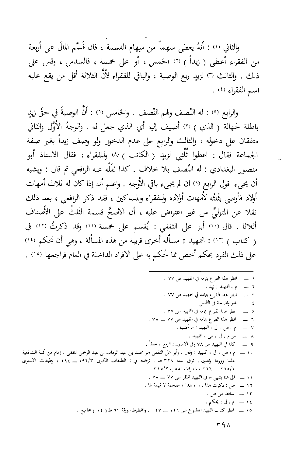 وَالرَّابِع لَهُ النّصْف وَلَهُم النّصْف وَالْخَامِس أَن الْوَصِيَّة فِي حق زيد بَاطِلَة لجَهَالَة الَّذِي اضيف إِلَيْهِ أَي الَّذِي جعل لَهُ وَالْوَجْه الأول وَالثَّانِي متفقان على دُخُوله وَالثَّالِث وَالرَّابِع على عدم الدُّخُول وَلَو وصف زيدا بِغَيْر صفة الْجَمَاعَة فَقَالَ اعطوا ثُلثي لزيد الْكَاتِب وللفقراء فَقَالَ الْأُسْتَاذ أَبُو مَنْصُور الْبَغْدَادِيّ لَهُ النّصْف بِلَا خلاف كَذَا نَقله عَنهُ الرَّافِعِيّ ثمَّ قَالَ وَيُشبه أَن يَجِيء قَول الرَّابِع إِن لم يجىء بَاقِي الْأَوْجه وَاعْلَم أَنه إِذا كَانَ لَهُ ثَلَاث أُمَّهَات أَوْلَاد فأوصى بِثُلثِهِ لأمهات أَوْلَاده وللفقراء وَالْمَسَاكِين فقد ذكر الرَّافِعِيّ بعد ذَلِك نقلا عَن الْمُتَوَلِي من غير اعْتِرَاض عَلَيْهِ أَن الْأَصَح قسْمَة الثُّلُث على الْأَصْنَاف أَثلَاثًا قَالَ أَبُو عَليّ الثَّقَفِيّ يقسم على خَمْسَة وَقد ذكرت فِي كتاب التَّمْهِيد مَسْأَلَة أُخْرَى قريبَة من هَذِه الْمَسْأَلَة وَهِي أَن نحكم على ذَلِك الْفَرد بِحكم أخص مِمَّا حكم بِهِ على الْأَفْرَاد الدَّاخِلَة فِي الْعَام فَرَاجعهَا
