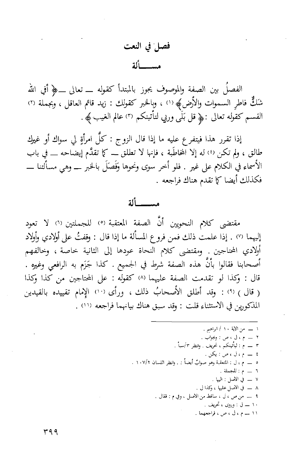 مُقْتَضى كَلَام النَّحْوِيين أَن الصّفة المعتقبة للجملتين لَا تعود إِلَيْهِمَا إِذا علمت ذَلِك فَمن فروع الْمَسْأَلَة مَا إِذا قَالَ وقفت على أَوْلَادِي وَأَوْلَاد أَوْلَادِي المحتاجين وَمُقْتَضى كَلَام النُّحَاة عودهَا إِلَى الثَّانِيَة خَاصَّة وَخَالفهُم أَصْحَابنَا فَقَالُوا بِأَن هَذِه الصّفة شَرط فِي الْجَمِيع كَذَا جزم بِهِ الرَّافِعِيّ وَغَيره قَالَ وَكَذَا لَو تقدّمت الصّفة عَلَيْهِمَا كَقَوْلِه على المحتاجين من كَذَا وكذاقال وَقد أطلق الْأَصْحَاب ذَلِك وَرَأى الإِمَام تَقْيِيده بالقيدين الْمَذْكُورين فِي الِاسْتِثْنَاء قلت وَقد سبق هُنَاكَ بيانهما فَرَاجعه