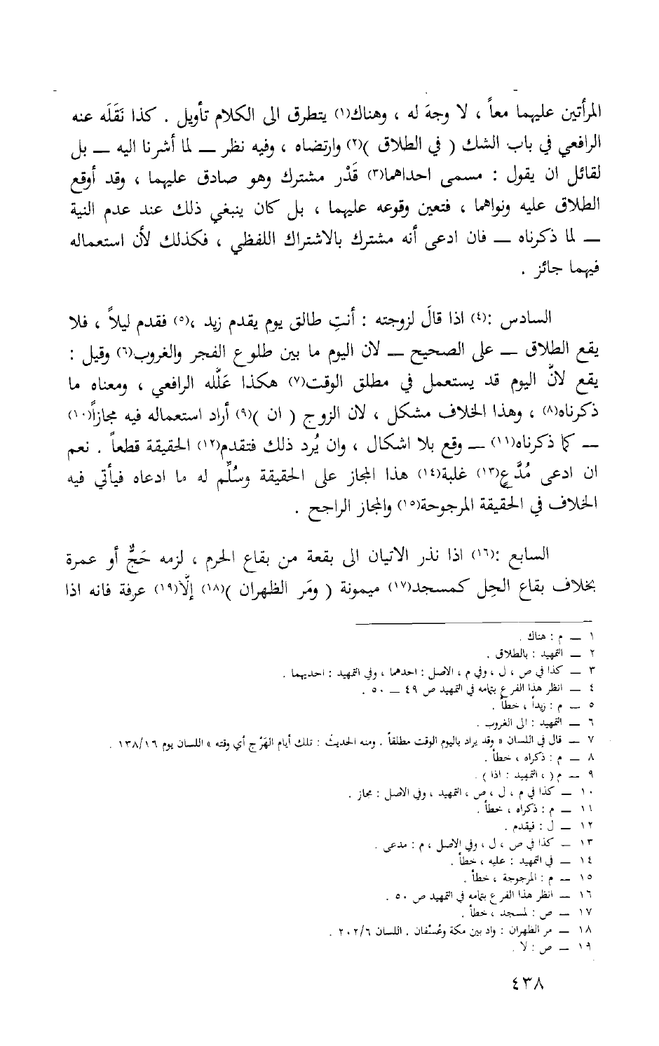 السَّادِس إِذا قَالَ لزوجته أَنْت طَالِق يَوْم يقدم زيد فَقدم لَيْلًا فَلَا يَقع الطَّلَاق على الصَّحِيح لِأَن الْيَوْم مَا بَين طُلُوع الْفجْر والغروب وَقيل يَقع لِأَن الْيَوْم قد يسْتَعْمل فِي مُطلق الْوَقْت هَذَا علله الرَّافِعِيّ وَمَعْنَاهُ مَا ذَكرْنَاهُ وَهَذَا الْخلاف مُشكل لَان الزواج ان أَرَادَ اسْتِعْمَاله فِيهِ مجَازًا كَمَا ذَكرْنَاهُ وَقع بِلَا إِشْكَال وَإِن يرد ذَلِك فَتقدم الْحَقِيقَة قطعا نعم إِن ادّعى مُدع غَلَبَة هَذَا الْمجَاز على الْحَقِيقَة وَسلم لَهُ مَا ادَّعَاهُ فَيَأْتِي فِيهِ الْخلاف فِي الْحَقِيقَة المرجوحة وَالْمجَاز الرَّاجِح