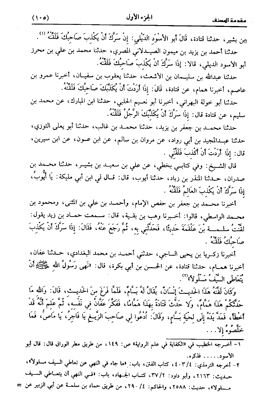 حَدَّثَنَا عَبد اللَّهِ بْنُ سُلَيْمَانَ بْنِ الأَشْعَثِ، حَدَّثَنا يَعْقُوبُ بْنُ سُفْيَانَ، أَخْبَرنا عَمْرو بْنُ عَاصِمٍ، أَخْبَرنا هَمَّامٌ، عَنْ قَتَادَةَ قَال: إِذَا أَرَدْتَ أَنْ يُكَذِّبَكَ صَاحِبُكَ فَلَقَِّنْهُ.