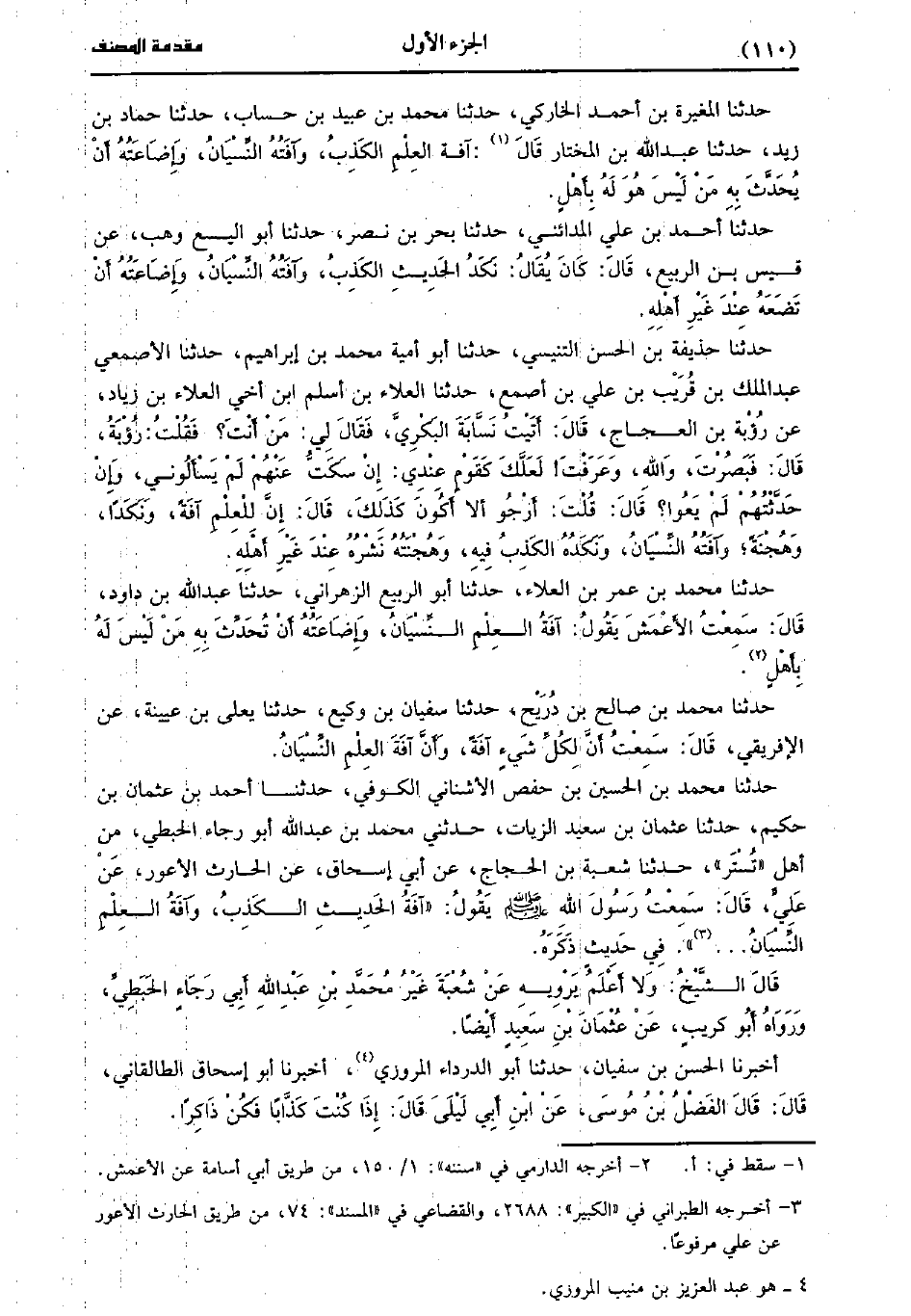 حَدَّثَنَا حُذَيْفَةُ بْنُ الْحَسَنِ التَّنِيسِيُّ، حَدَّثَنا أَبُو أُمَيَّةَ مُحَمد بْنُ إِبْرَاهِيمَ، حَدَّثَنا الأَصْمَعِيُّ عَبد الْمَلِكِ بْنُ قُرَيْبِ بْنِ عَلِيِّ بْنِ أَصْمَعَ، حَدَّثَنا الْعَلاءُ بْنُ أَسْلَمَ ابْنُ أَخِي الْعَلاءِ بْنُ زِيَادٍ، عَنْ رُؤْبَةَ بْنِ الْعَجَّاجِ قَال: أَتَيْتُ نَسَّابَةَ الْبَكْرِيَّ فَقَالَ لِي: مَنْ أنْتَ؟ فَقُلْتُ: رُؤْبَةُ، قَال: فَبَصُرْتَ وَاللَّهِ وَعَرَفْتَ، لَعَلَّكَ كَقَوْمٍ عِنْدِي إنْ سَكَتُّ عَنْهُمْ لَمْ يَسْأَلُونِي، وَإِنْ حَدَّثْتُهُمْ لَمْ يعوا، قالَ: قُلتُ: أرجو أن لا أَكُونَ كَذَلِكَ، قَال: إِنَّ لِلْعِلْمِ آفَةً، وَنَكَدًا، وَهُجْنَةً، وَآفَتُهُ النِّسْيَانُ، وَنَكَدُهُ الْكَذِبُ فِيهِ، وَهُجْنَتُهُ نَشْرُهُ عِنْدَ غَيْرِ أَهْلِهِ.