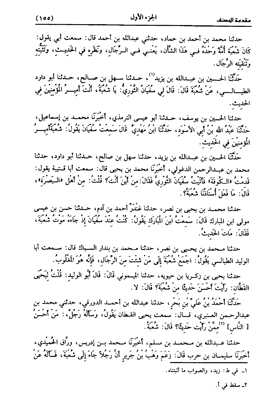 حَدَّثَنَا مُحَمد بْنُ أَحْمَدَ بْنِ حَمَّادٍ، حَدَّثني عَبد اللَّهِ بْنُ أَحْمَدَ، قَالَ: سَمِعْتُ أَبِي يَقُولُ: كَانَ شُعْبَة أُمَّةً وَحْدَهُ فِي هَذَا الشَّأْنِ، يَعْنِي فِي الرِّجَالِ، وَنَظَرِهِ فِي الْحَدِيثِ، وَتَثَبُّتِهِ، وَتَنْقِيَتِهِ الرِّجَالَ.
