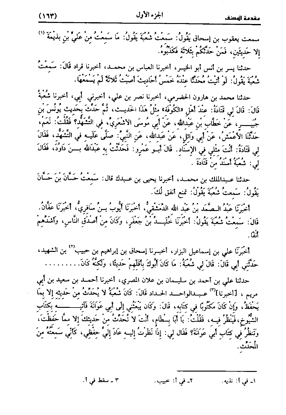 حَدَّثَنَا مُحَمد بْنُ هَارُونَ الْحَضْرَمِيُّ، أَخْبَرنا نَصْرُ بْنُ عَلِيٍّ، أَخْبَرَنِي أَبِي، أَخْبَرنا شُعْبَة، قَال: قَال لِي قَتَادَةُ: عِنْدَ أَهْلِ الْكُوفَةِ مِثْلُ هَذَا الْحَدِيثِ، ثُمّ حَدَّثَ بِحَدِيثِ يُونُس بْنِ جُبَيْرٍ، عَنْ خَطَّابِ بْنِ عَبد اللَّهِ، عَن أَبِي مُوسَى الأَشْعَرِيِّ فِي التَّشَهُّدِ؟ فقلتُ: نَعَم، حَدَّثَنا الأَعْمَش، عَن أَبِي وَائِلٍ، عَنْ عَبد اللَّهِ، عَنِ النَّبِيِّ صَلَّى عَلَيْهِ فِي التَّشَهُّدِ، فَقَالَ لِي قَتَادَةُ: أَنْتَ مِثْلِي فِي الإِسْنَادِ. قَالَ أَبُو عَمْرو: فَحَدَّثْتُ بِهِ عَبد اللَّهِ بْنَ دَاوُدَ فَقَالَ لِي: شُعْبَة أَسْنَدُ مِنْ قَتَادَةَ.