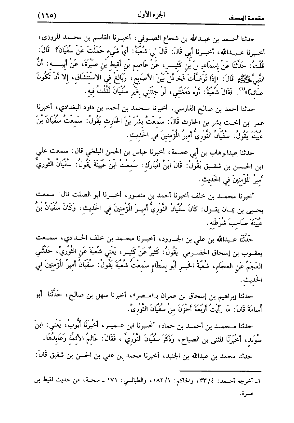 حَدَّثَنَا أَحْمَدُ بْنُ عَبد اللَّهِ بْنِ شُجَاعٍ الصُّوفيّ، أَخْبَرنا الْقَاسِمُ بْنُ مُحَمد الْمَرْوَزِيُّ، أَخْبَرنا عَبد اللَّهِ، أَخْبَرنا أَبِي، قَال: قَال لِي شُعْبَة: أَيَّ شَيْءٍ حَمَلْتَ عَنْ سُفْيَانَ؟ قالَ: قُلتُ: حَدَّثَنا عَنْ إِسْمَاعِيلَ بْنِ كَثِيرٍ، عَن عَاصِمِ بْنِ لَقِيطِ بْنِ صَبْرَةَ، عَنْ أَبِيهِ؛ أَنّ النَّبِيَّ صَلَّى اللَّهُ عَلَيه وسَلَّم قَال: إِذَا تَوَضَّأْتَ فَخَلِّلْ بَيْنَ الأَصَابِعِ وَبَالِغْ فِي الاسْتِنْشَاقِ إلاَّ أَنْ تَكُونَ صَائِمًا. فَقَالَ شُعْبَة: أَوْه، دَمَغْتَنِي لَوْ جِئْتَنِي بِغَيْرِ سُفْيَانَ لَقُلْتُ فِيهِ.