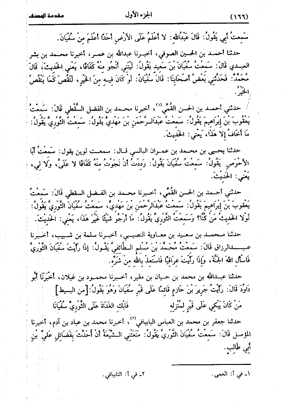 مَنْ كَانَ يَبْكِي عَلَى قَبْرٍ لمنزله ... فابكي الْغَدَاةَ عَلَى الثَّوْريّ سُفْيَانَا