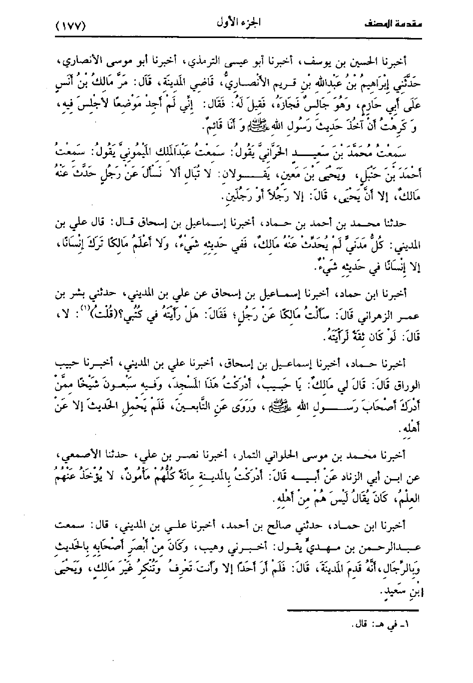 حَدَّثَنَا حَمَّادٍ، أَخْبَرنا إِسْمَاعِيلُ بْنُ إِسْحَاقَ، أَخْبَرنا عَلِيُّ بْنُ الْمَدْيَنِيِّ، أَخْبَرنا حَبِيبٌ الْوَرَّاقُ، قَال: قَال لِي مَالِكٌ: يَا حَبِيبُ، أَدْرَكْتُ هَذَا الْمَسْجِدَ وَفِيهِ سَبْعُونَ شَيْخًا مِمَّنْ أَدْرَكَ أَصْحَابَ رَسُولِ اللَّهِ صَلَّى اللَّهُ عَلَيْهِ وَسَلَّمَ وَرَوَى عَنِ التَّابِعِينَ فَلَمْ يَحْمِلِ الْحَدِيثَ إلاَّ عن أهله.