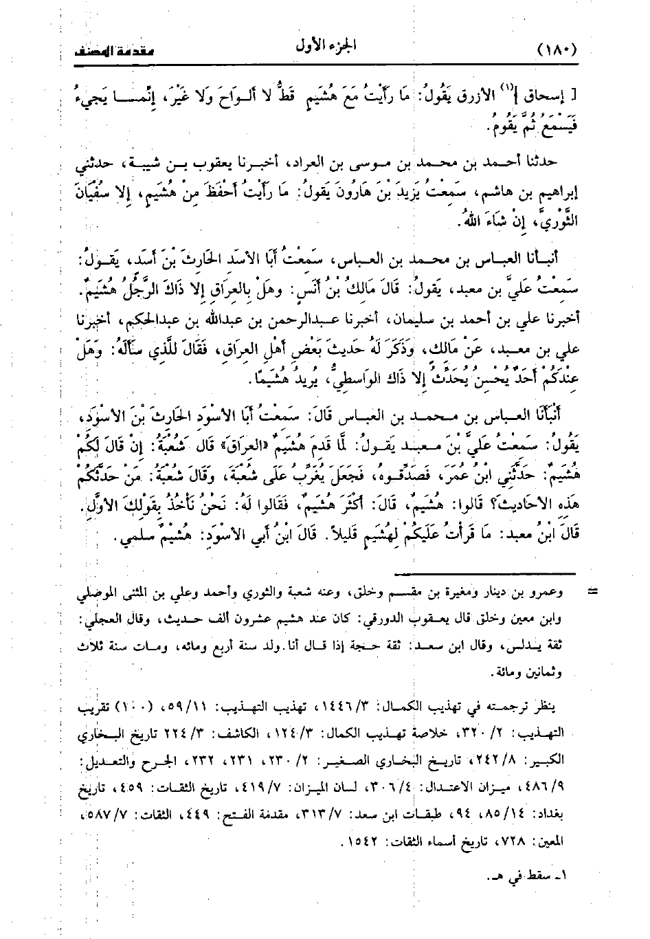أَخْبَرنا الْعَبَّاسُ بْنُ مُحَمد بْنِ الْعَبَّاسِ، سَمِعْتُ أَبَا الأَسَدِ الْحَارِثَ بْنَ أَسَدٍ يَقُولُ: سَمعتُ عَلِيَّ بْنَ مَعْبَدٍ يَقُولُ: قَالَ مَالِكُ بْنُ أَنَسٍ: وَهَلْ بِالْعِرَاقِ إلاَّ ذاك الرجل هشيم.
