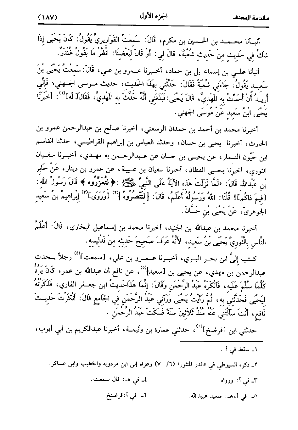 حَدَّثَنَا مُحَمد بْنُ أَحْمَدَ بْنِ حمدان الرَّسْعِنِيُّ، أَخْبَرنا صَالِحُ بْنُ عَبد الرَّحْمَنِ بْنِ (1) عَمْرو بْنِ الْحَارِثِ، أَخْبَرنا يَحْيى بن حسان (ح) وَحَدَّثَنَا الْعَبَّاسُ بْنُ إِبْرَاهِيمَ الْقَرَاطِيسِيُّ، حَدَّثَنا الْقَاسِمُ بْنُ حَيُّونَ التَّمَّارُ، عَنْ يَحْيى بْنِ حَسَّانَ، عَنْ عَبد الرَّحْمَنِ بْنِ مَهْدِيٍّ، أَخْبَرنا سُفْيَانُ الثَّوْريّ، أَخْبَرنا يَحْيى الْقَطَّانُ، أَخْبَرنا سُفْيَانُ بْنُ عُيَينة، عَنْ عَمْرو بْنِ دِينَارٍ، عَنْ جَابِرِ بْنِ عَبد اللَّهِ، قَال: لَمَّا نَزَلت هَذِهِ الآيَةُ عَلَى النَّبِيِّ صَلَّى اللَّهُ عَلَيْهِ وَسَلَّمَ {لِتُعَزِّرُوهُ} قَال رَسُول اللهِ صَلَّى اللَّهُ عَلَيْهِ وَسَلَّمَ: فِيمَ ذَاكُمْ؟ قُلْنَا: اللَّهُ وَرَسُولُه ُأعَلْمُ قَالَ: لِتَنْصُرُوهُ. وَرَوَى إِبْرَاهِيمُ بْنُ سَعِيد الْجَوْهَرِيُّ، عن يَحْيى بن حسان.