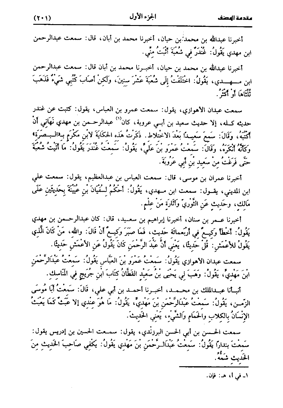 سمعت الحسن بن أبي الحسين الْبَرْزَنْدِيَّ يَقُولُ: سَمعتُ الْحُسَيْنَ بْنَ إِدْرِيسَ يَقُولُ: سَمعتُ بُنْدَارا يَقُولُ: سَمعتُ عَبد الرَّحْمَنِ بْنَ مَهْدِيٍّ يَقُولُ: يَكْفِي صَاحِبَ الْحَدِيثِ مِنَ الحديث شمه.