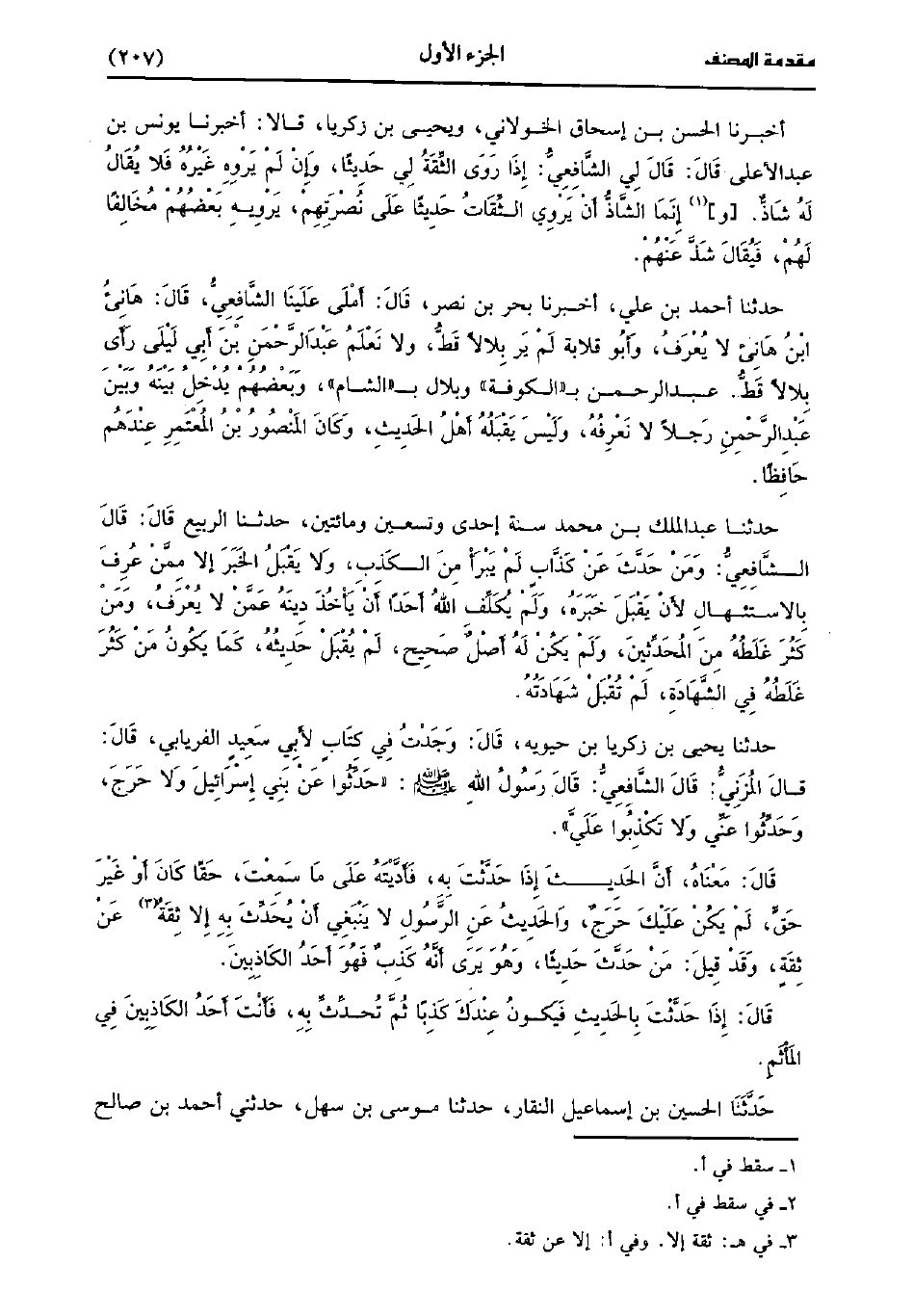 حَدَّثَنَا يَحْيى بْنُ زَكَرِيَّا بْنِ حَيْوَيْهِ قَالَ: وَجَدْتُ فِي كِتَابٍ لأَبِي سَعِيد الْفِرْيَابِيِّ، قَال: قَال الْمُزَنِيُّ: قَالَ الشَّافِعِيُّ: قَال رَسُول اللهِ صَلَّى اللَّهُ عَلَيْهِ وَسَلَّمَ: حَدِّثُوا عَنْ بَنِي إِسْرَائِيلَ ولاَ حَرَجَ، وَحَدِّثُوا عَنِّي، ولاَ تَكْذِبُوا عليَّ.